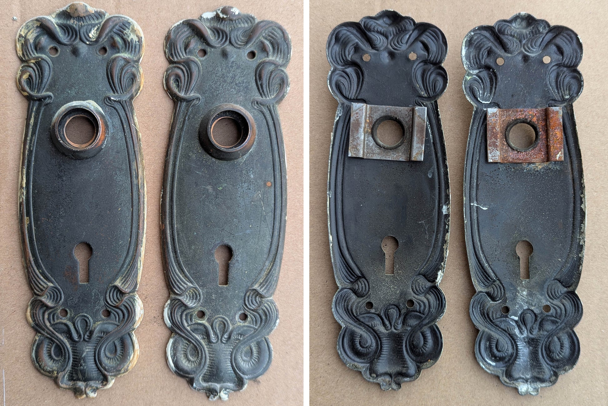 All parts are in great condition with only the typical tiny nicks and light scratches that you would expect to find on 100-year old hardware. There are no breaks, cracks, chips, dents, or deep scratches, etc.