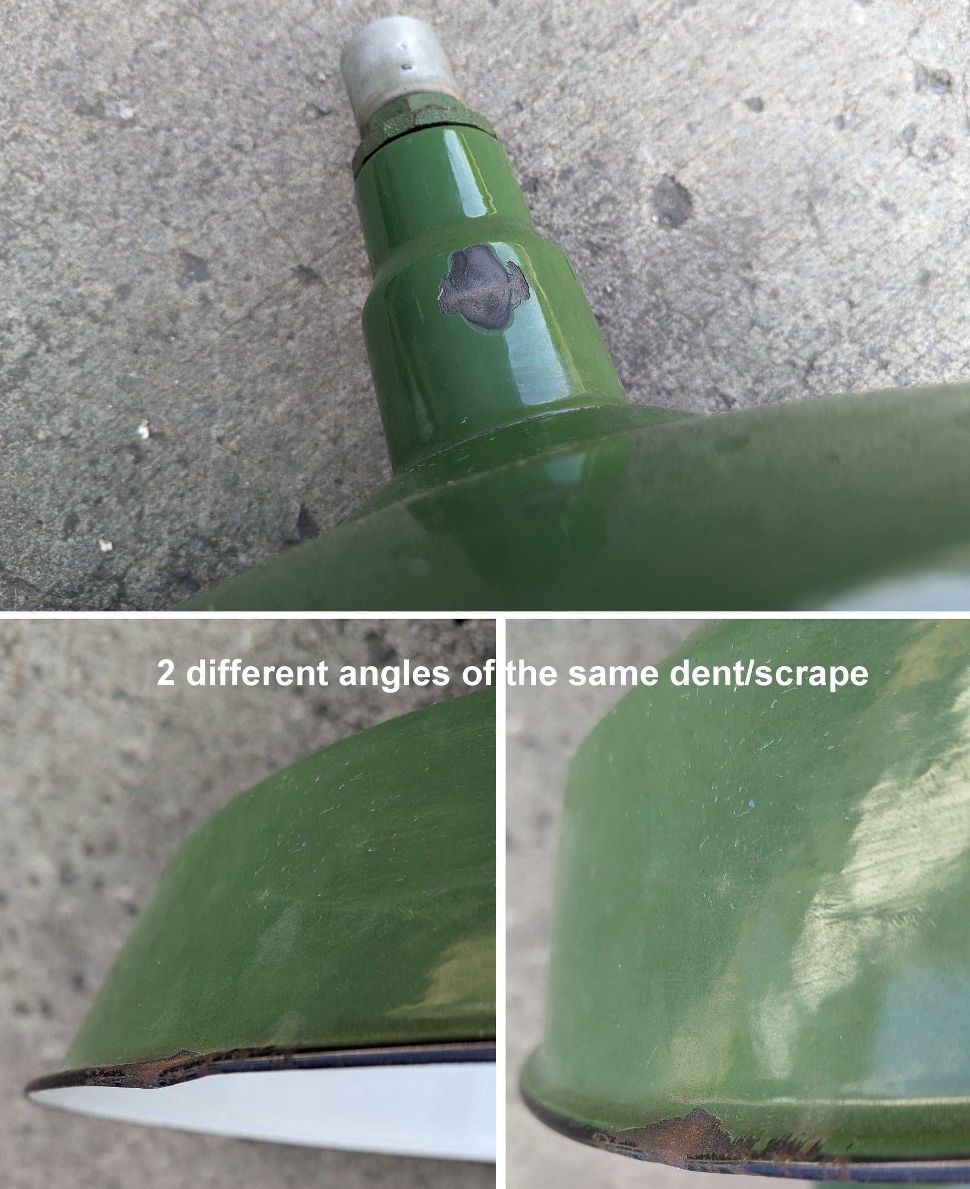 One light has a dent along it's rim and a very shallow dent on it's upper portion. There is porcelain missing in the dented areas (see last photo). The other 2 lights have no significant flaws to report. Expect nicks and light scratches here and there.