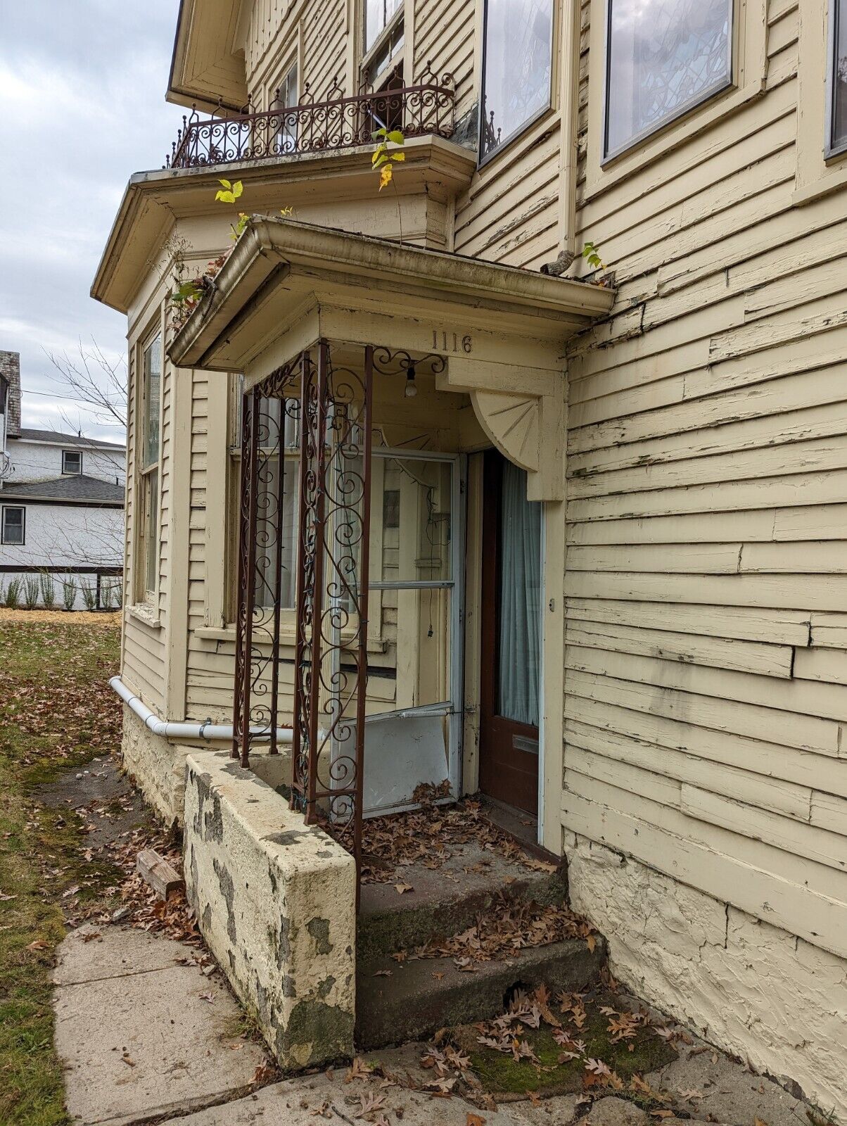 Handsome, antique, exterior door salvaged from an old, 1889 home in Northeastern, PA (see last photo). The door is made of solid Douglas fir or pine and is painted brown on both sides. It was one of the side doors of the home