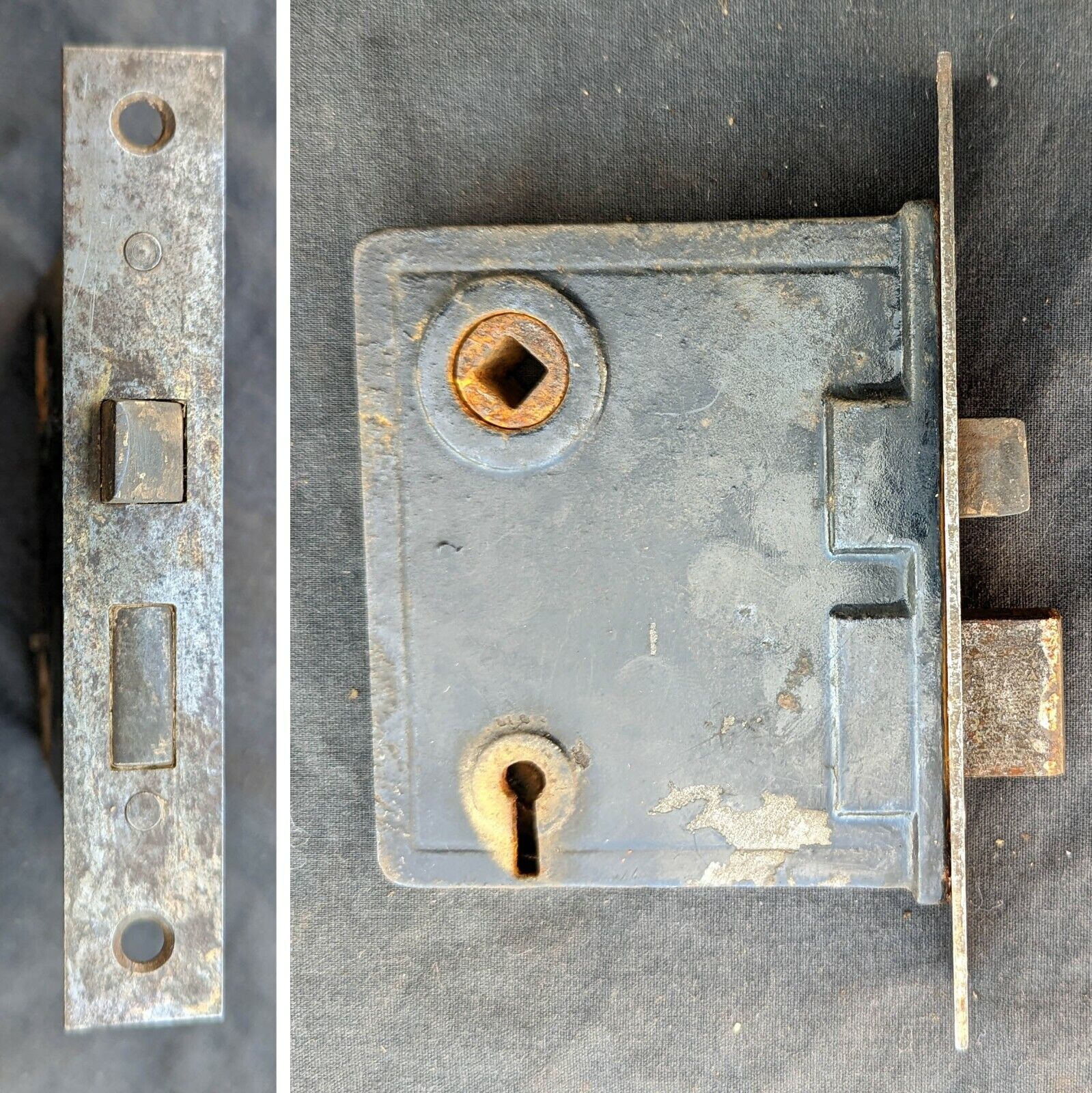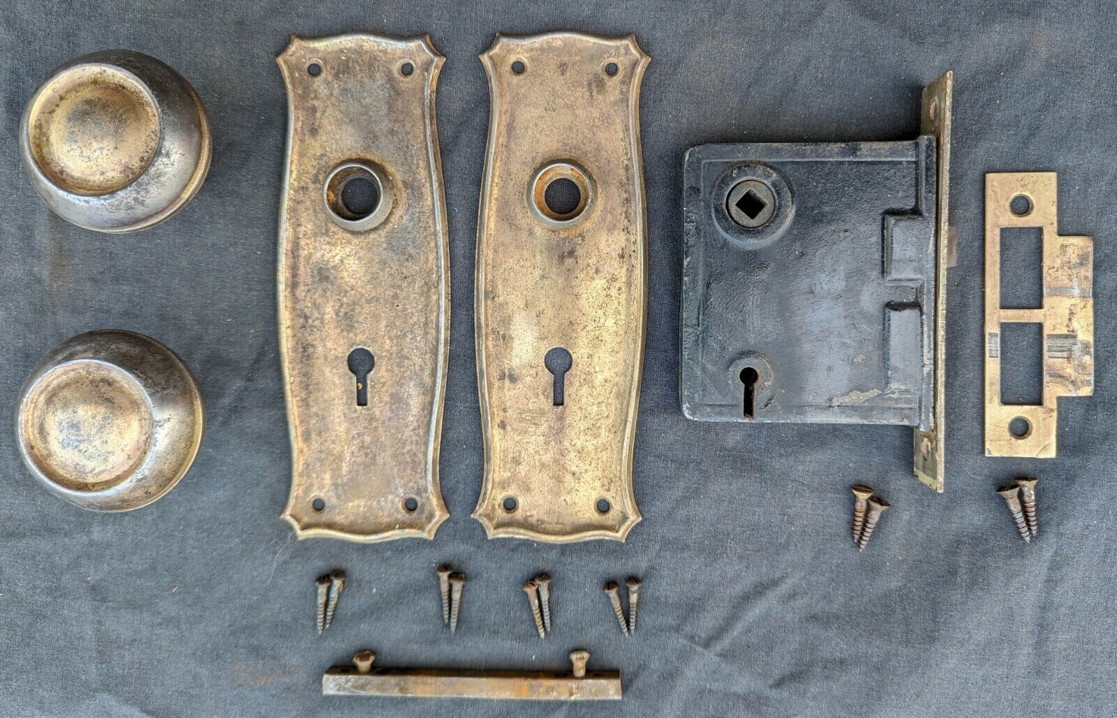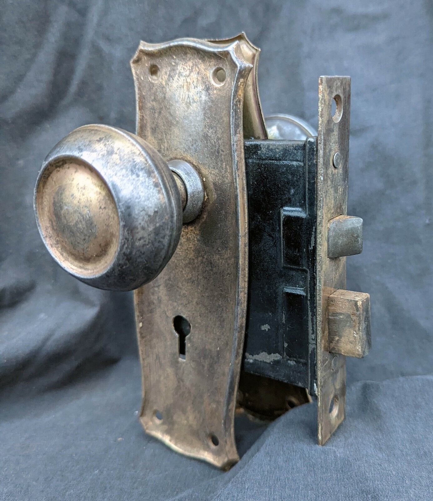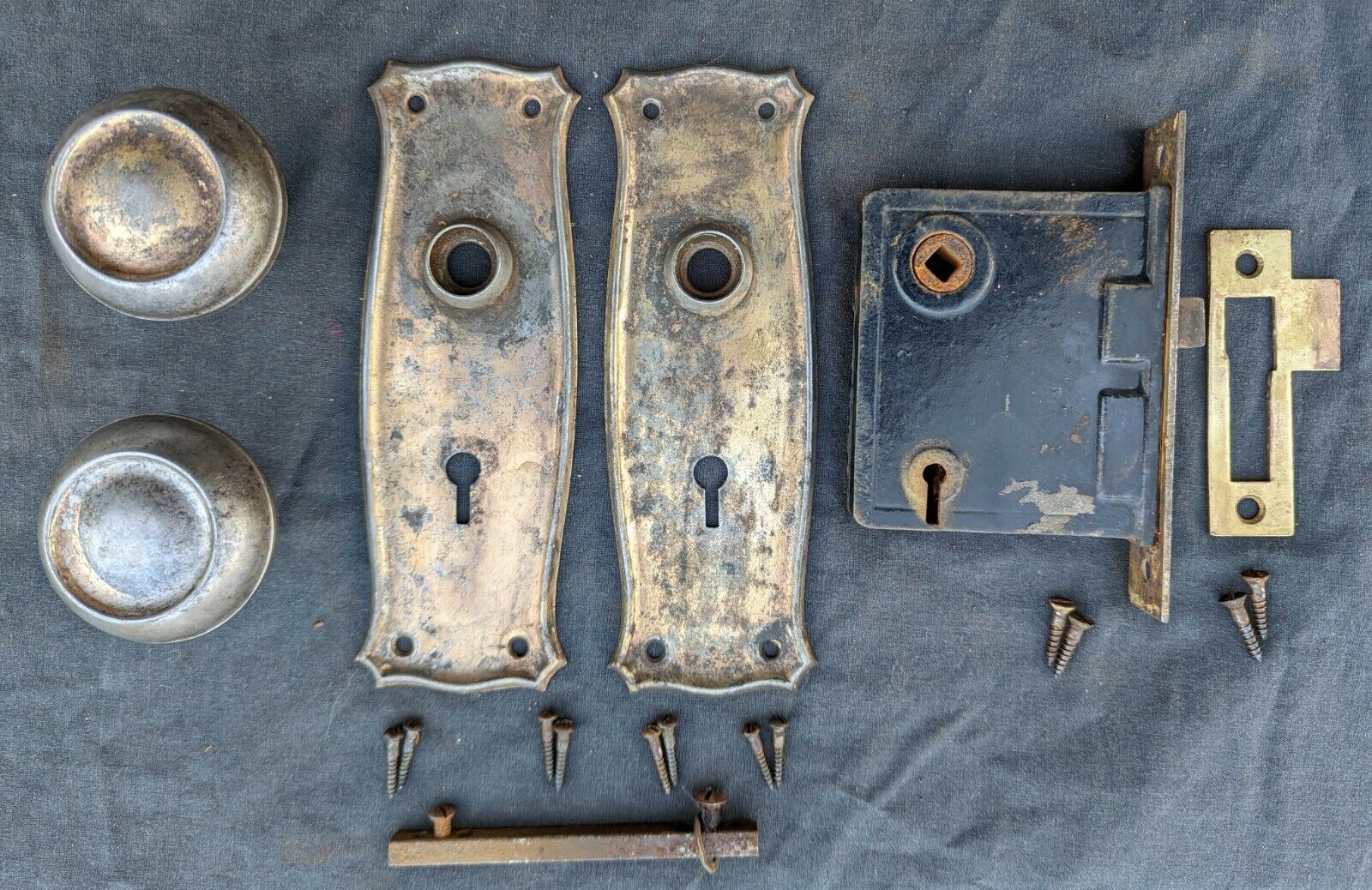 Cool, antique, Arts and Crafts style, interior door lockset salvaged from 1920's home in Northeastern PA. Each set is complete with all parts needed to install and use: 2 steel knobs, 2 stamped steel escutcheons, 1 steel mortise lock, 1 steel strike plate for the door jamb, 1 spindle with 2 setscrews to connect the knobs, and 12 installation screws to fasten the lock and plates to the door.