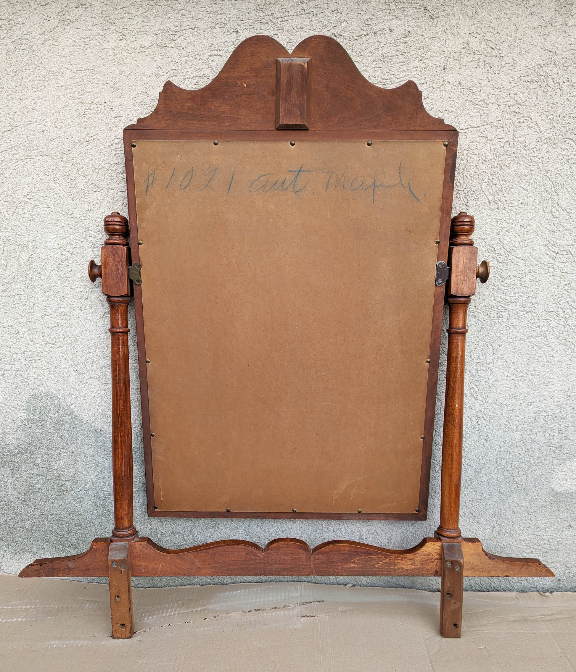 Beautiful, antique mirror salvaged from Northeastern Pennsylvania. The mirror's frame and the stand/harp are made of solid maple. The mirror attaches to the stand by 2 steel bolts with round, wooden ends which allow the mirror to swivel up and down.