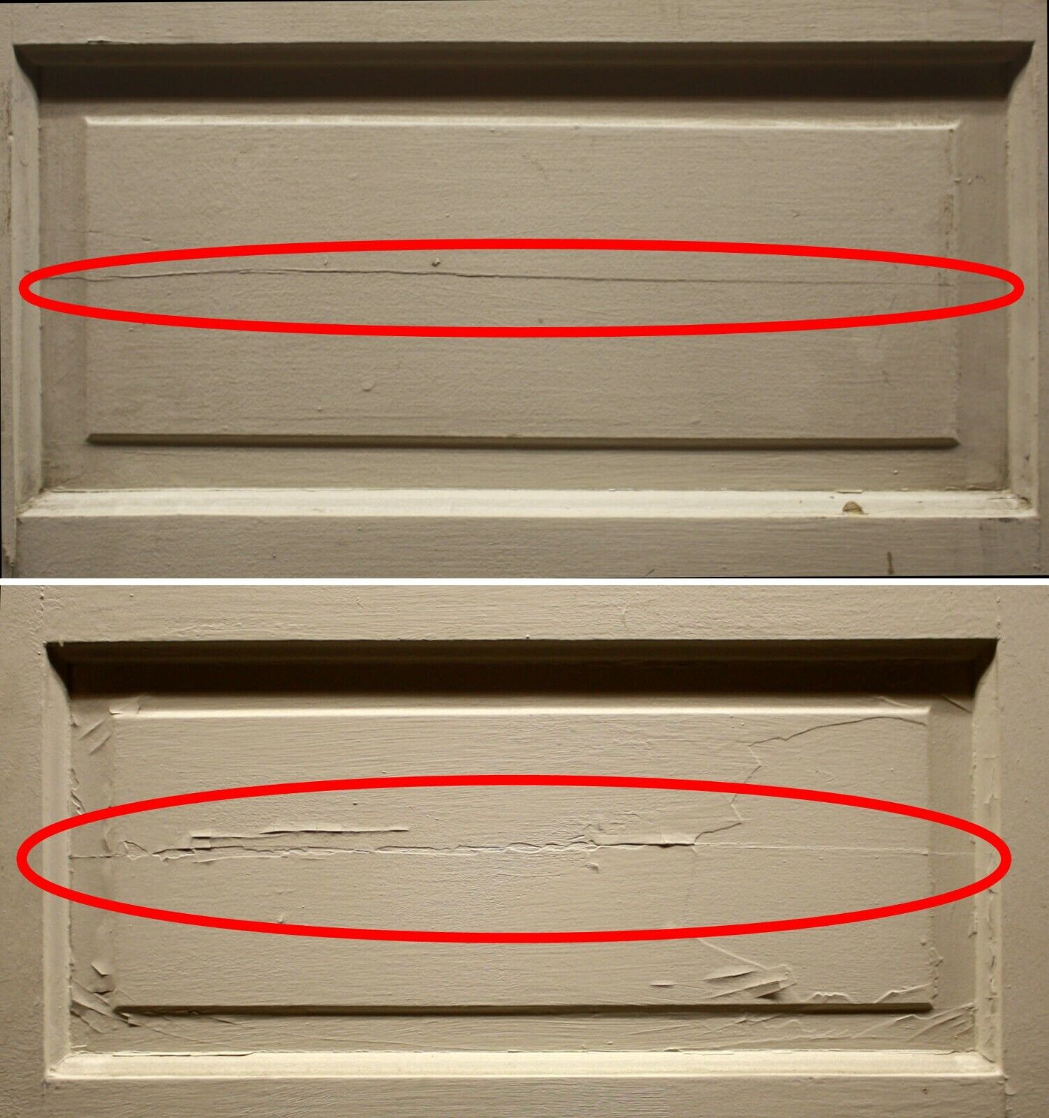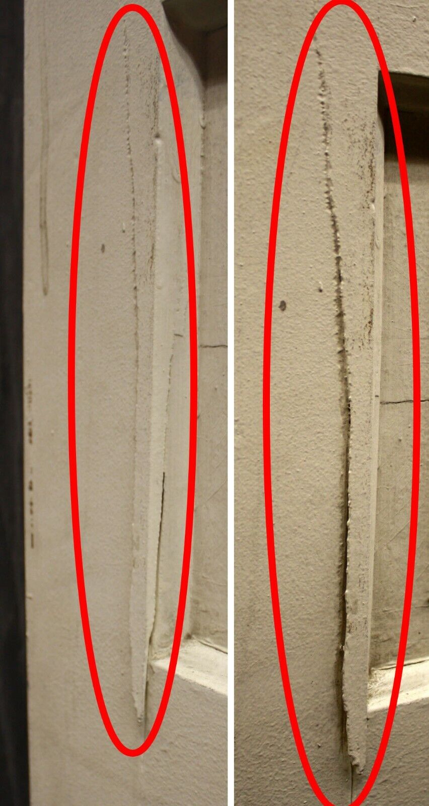 Uneven Width: The width was unevenly cut by 1/4". The cuts were most likely made to accommodate a warped floor or sagging foundation. We could cut the door to an even 28 3/8" x77 3/4".