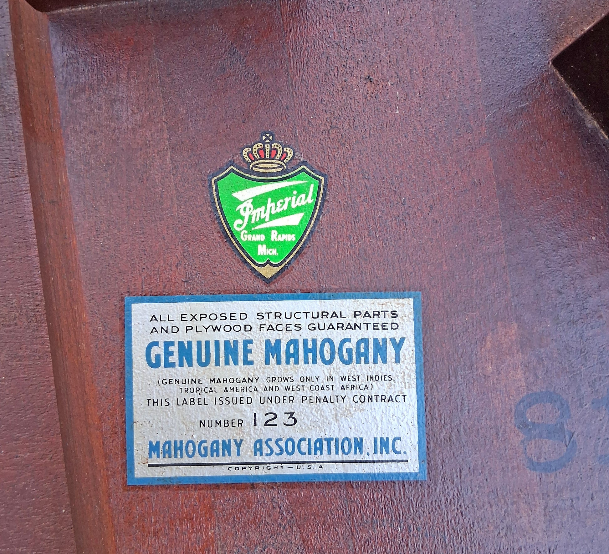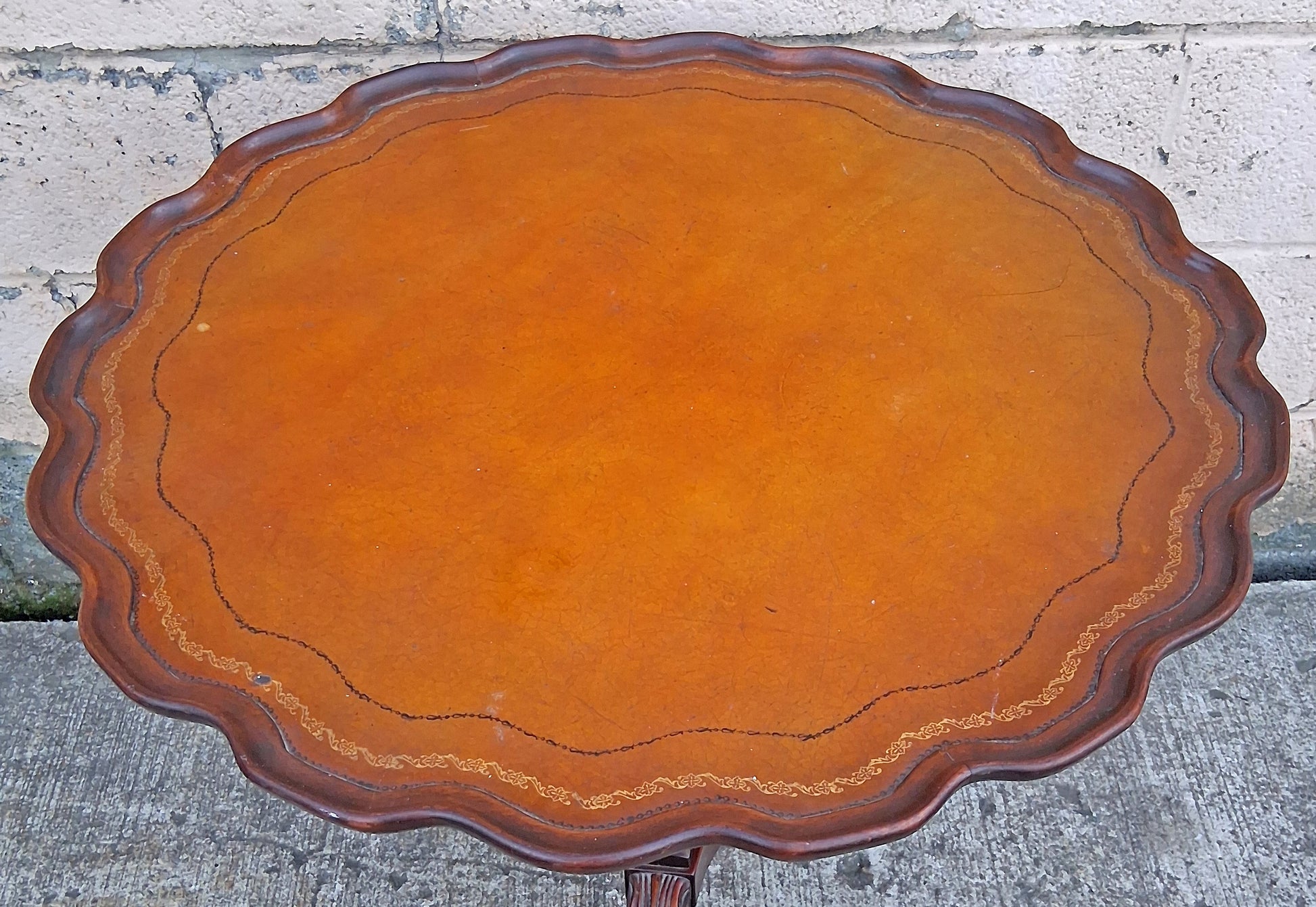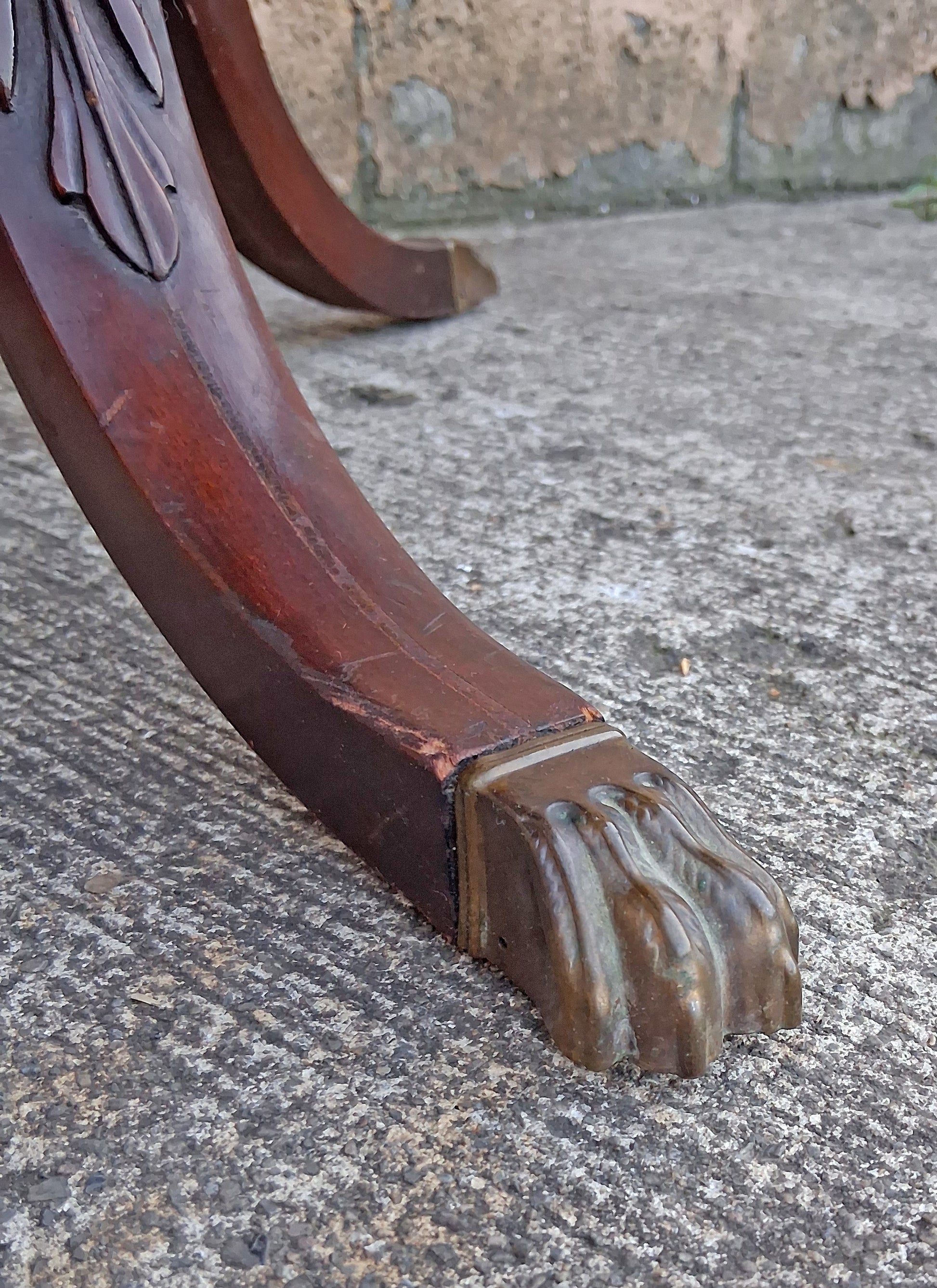 Beautiful, piecrust table salvaged from Northeastern PA. It's made of solid mahogany and has a reddish, medium-colored stain. The piece was made by Imperial out of Grand Rapids, Michigan. The pedestal has a beautiful design. Below the bottom are 3 cylindrical spindles connected to a base with 3 legs in a tripod formation. Notice the Acanthus leaves on each leg, and the brass, Duncan Phyfe, lion paw feet!