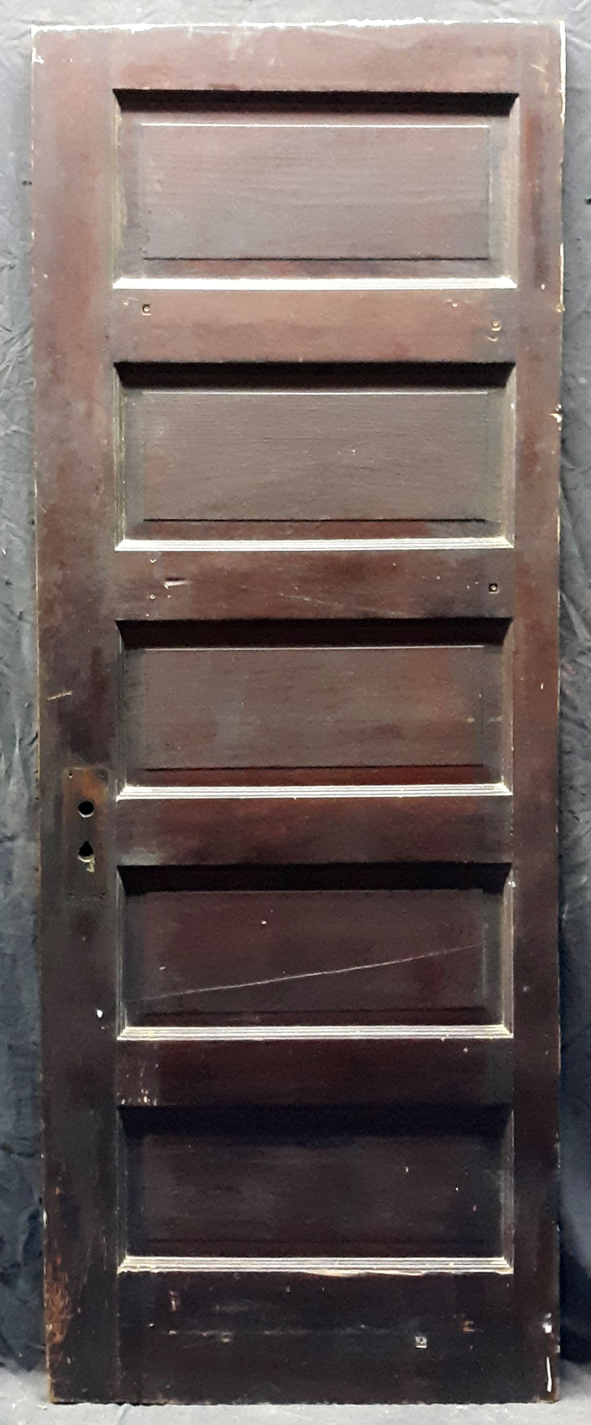 Elegant, antique interior door salvaged from an old, home in Northeastern Pennsylvania. The door is made of solid Douglas Fir or pine, and has 5 raised panels on both sides. The door is stained on both sides.