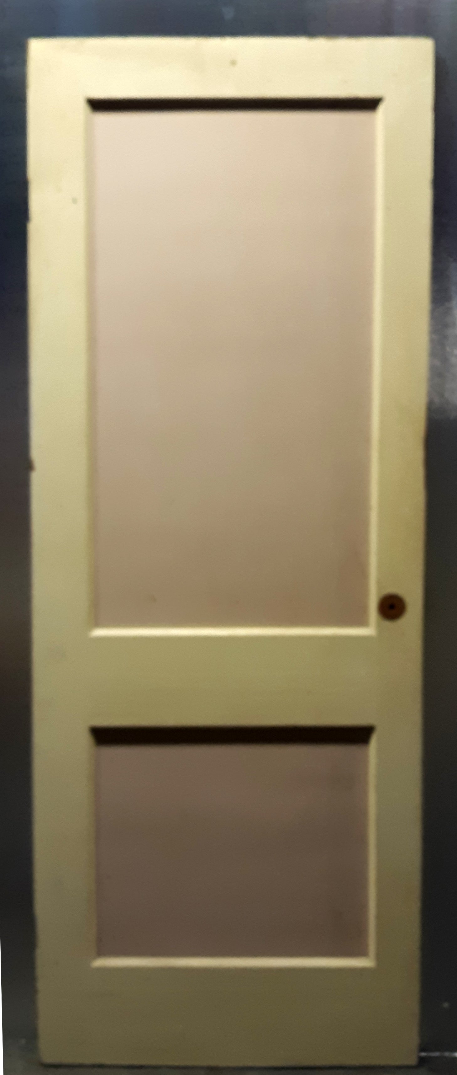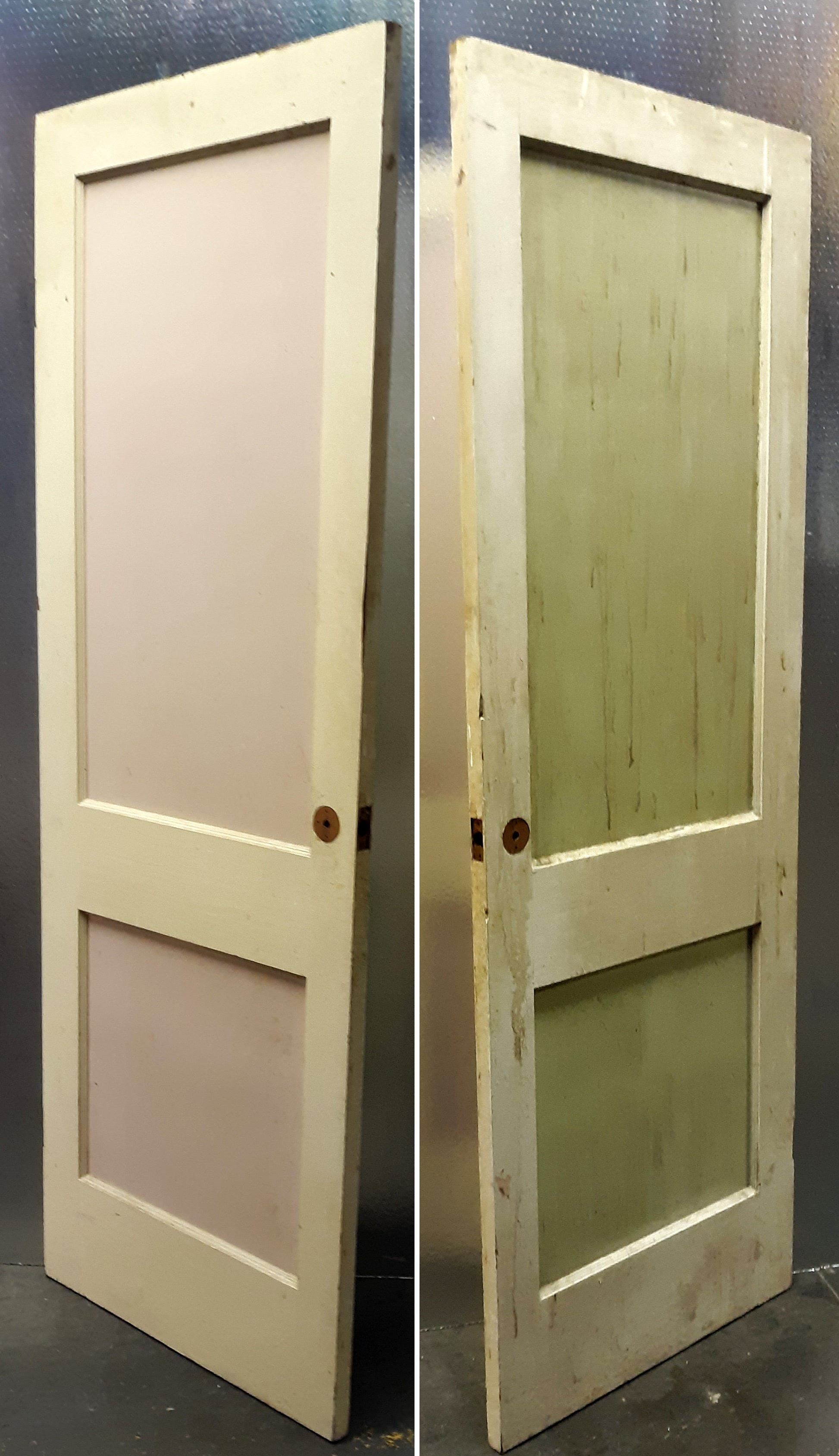 Handsome, antique, interior door salvaged from an old home in Northeastern, PA. The door is made of solid Douglas fir or pine, and has 2 recessed (flat) panels on both sides. The door is painted white-green on the exterior side and white-pink on the interior side.