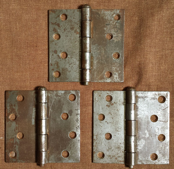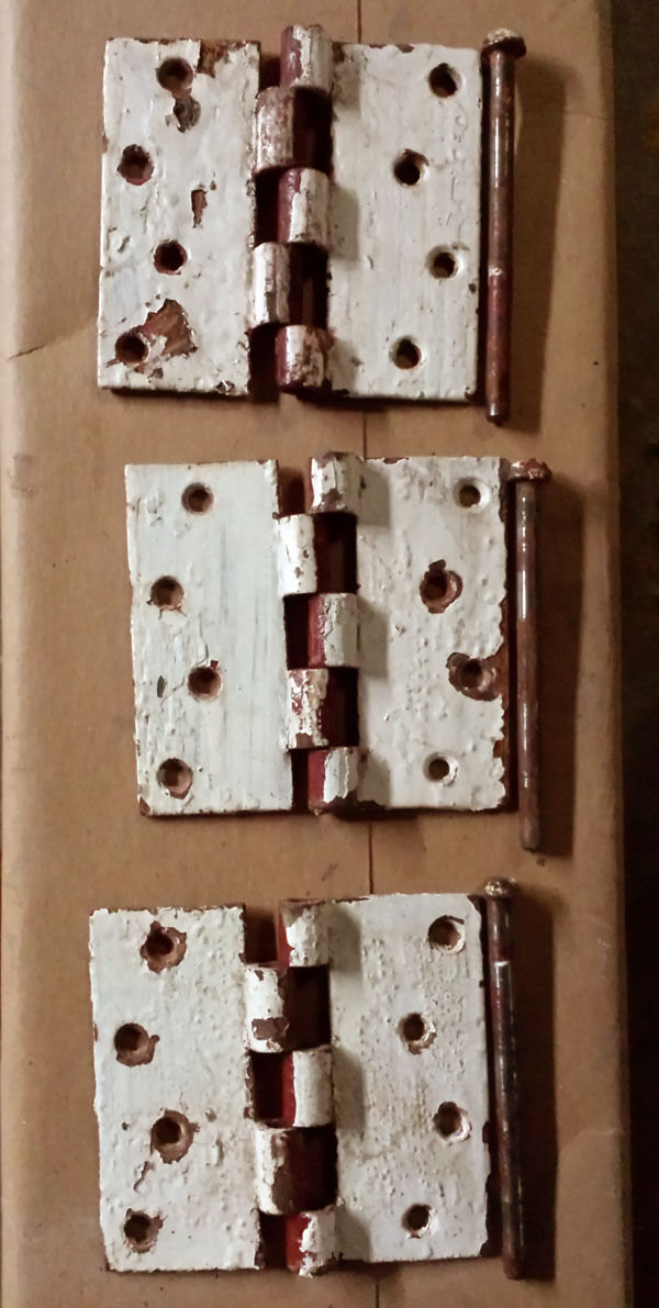 The hinges were removed from a big door that we salvaged from Northeastern Ohio. At the point of salvage, the hinges were covered under many layers of paint, they were dirty and rusty, they didn't open easily, and the pins wouldn't budge (see last photo). Since then, we completely removed the paint, and cleaned and polished each hinge to the best of our ability. Each hinge opens and closes with ease and the pins are also easy to remove.