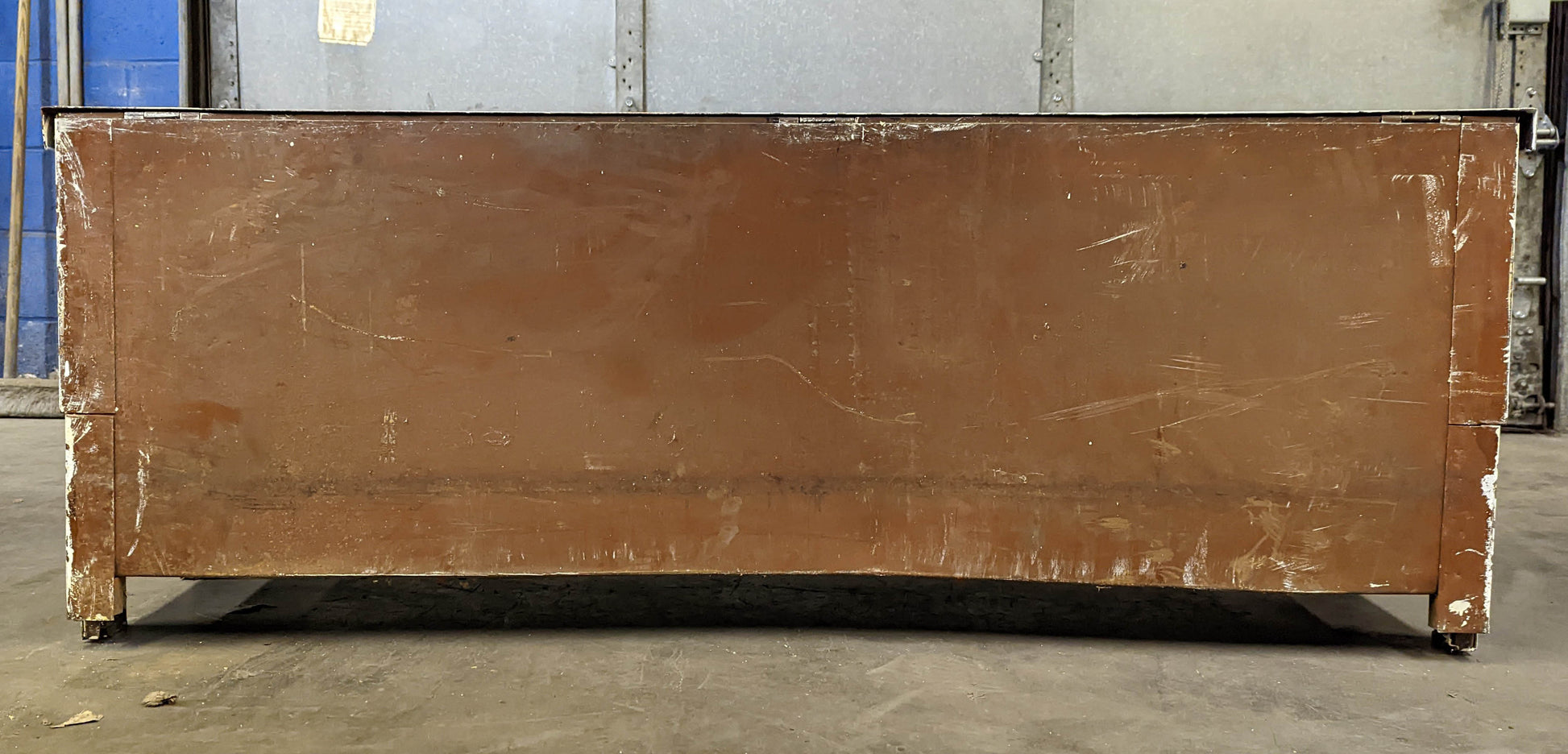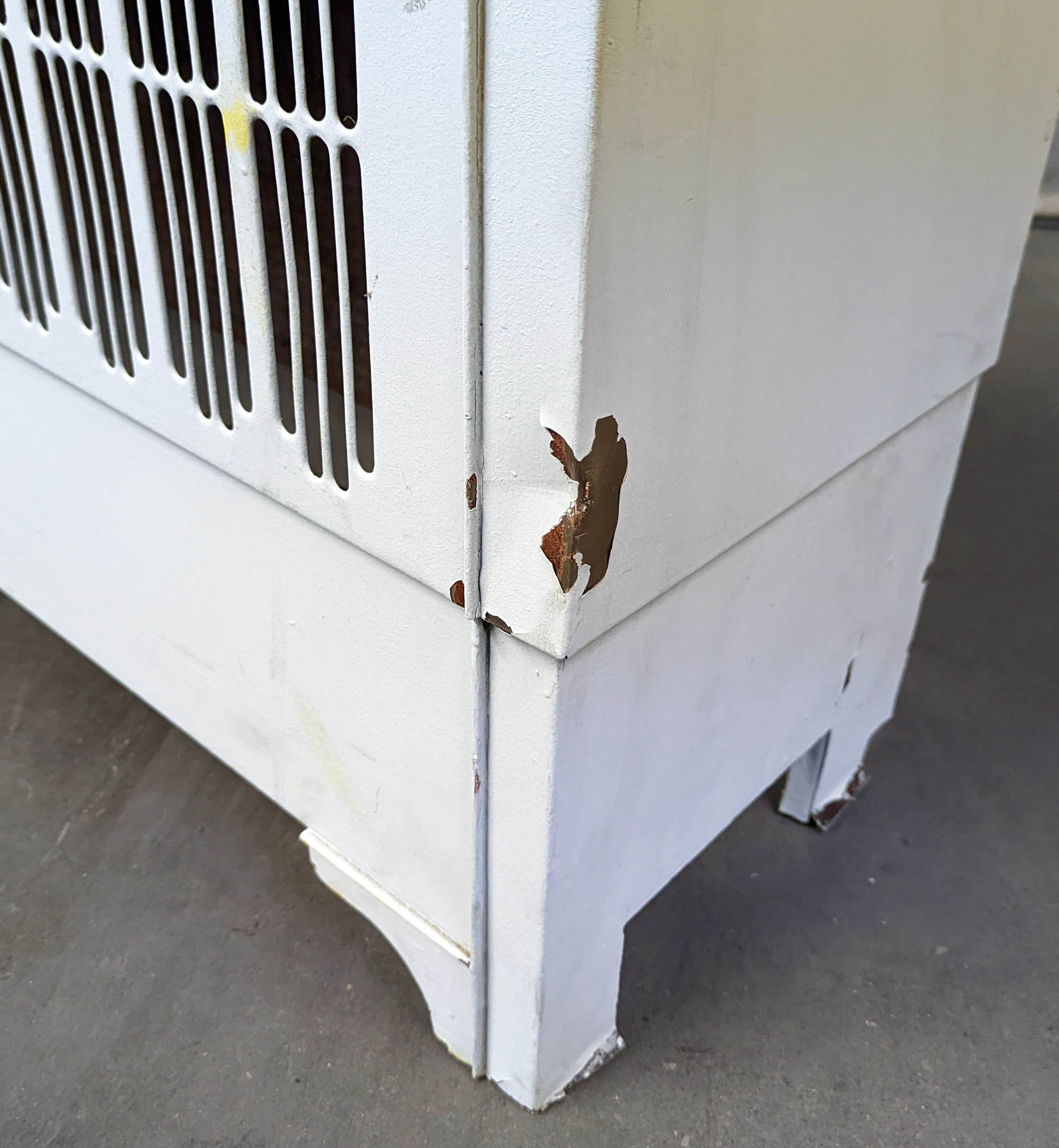 Both cabinets have a dent, which could be pushed out from the inside--we normally do this, but didn't notice them till it was time to take photos. We'll do our best to straighten them out prior to shipping. Cover#1 has dent in one of its front corners (see close up photo) and Cover#2 has a dent along the bottom of its back panel.
