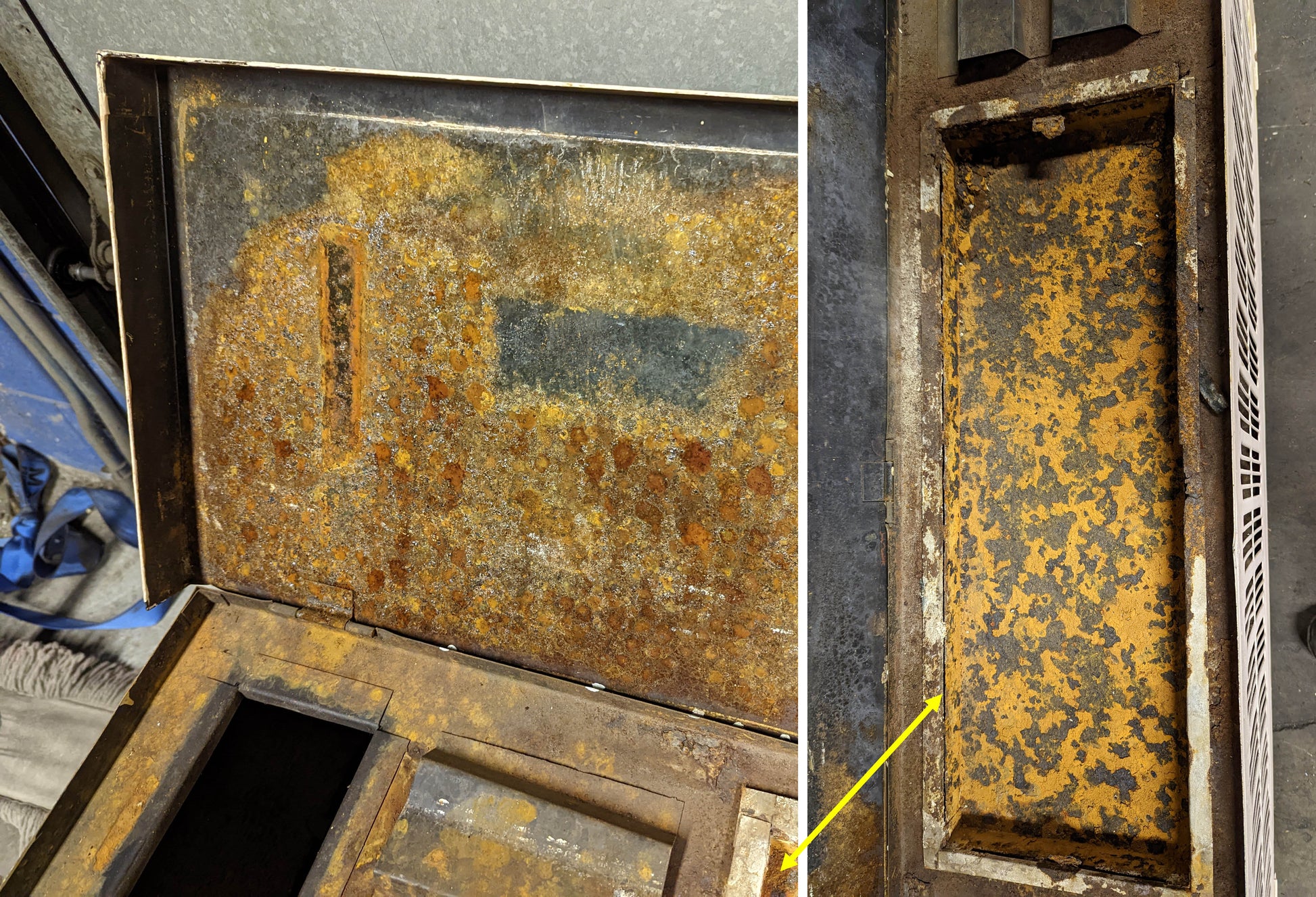 We wiped the outside of the covers with a dry paper towel prior to taking photos, and what you see in the photos are stains, rust, and spots of missing paint. The cabinets would look beautiful after a good sanding and a fresh coat of paint.