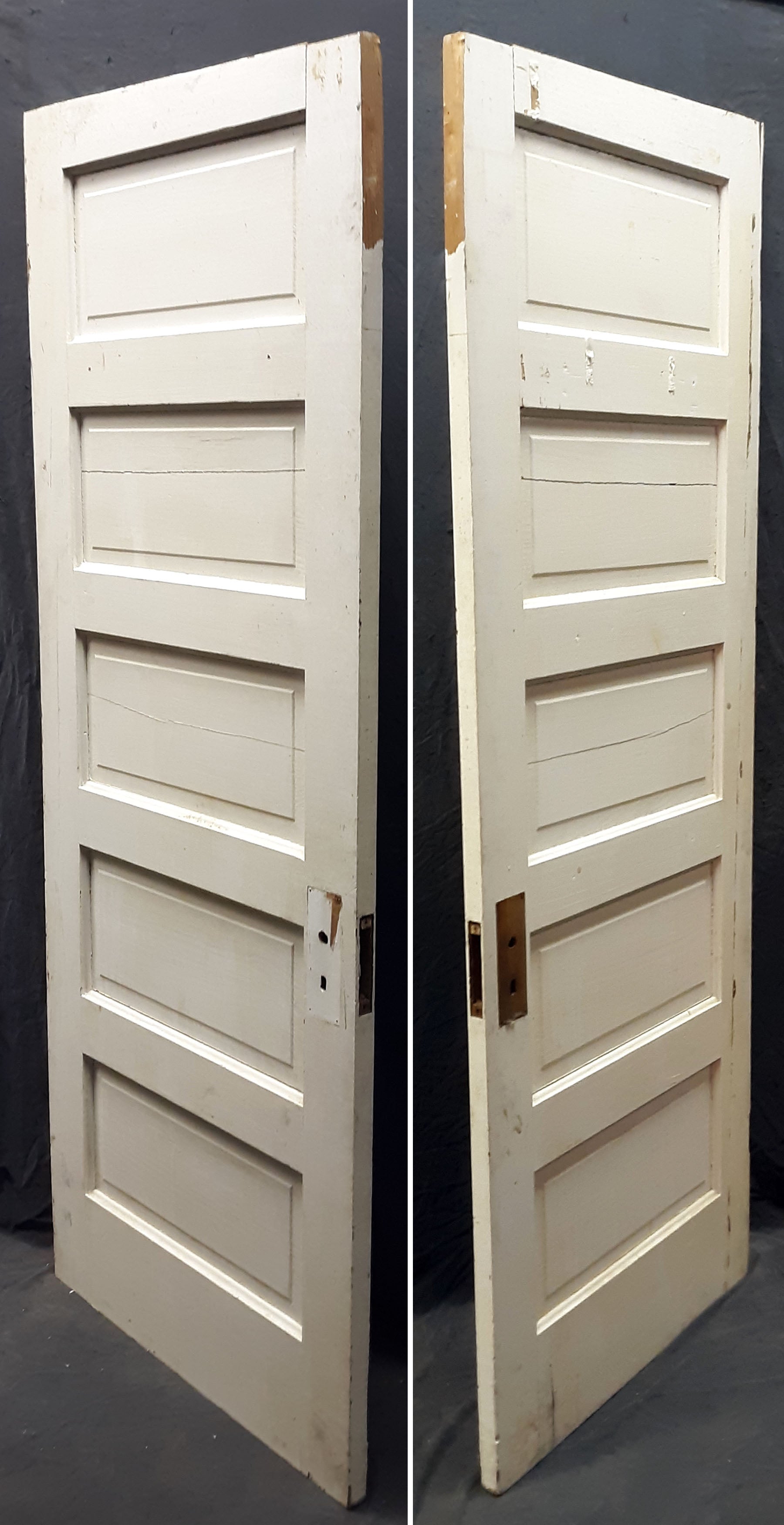 Condition: Considering the door is well over 100 years old, it is strong, sturdy and in great structural condition. It only has nicks and scratches, but broken or cracked joints, gouges, warp or any other serious issues. The door has a small break on the top corner of the interior lock-stile (see 4th photo). The door has 1 split panel and 1 cracked panel (see last photo). Expansion and contraction occurs naturally due to changes in temperature, and the cracks are just a result of this process over the course of many years. It may sound funny, but when the panels expanded and reached their limits within their openings or frames; they were unable to stretch out any further, and ultimately cracked in the center to relieve their stress or tension.