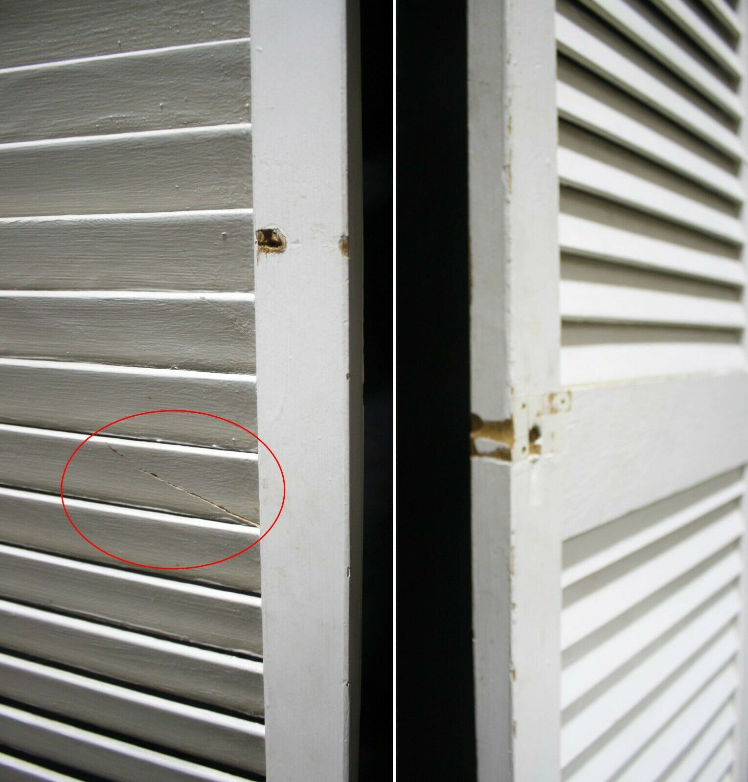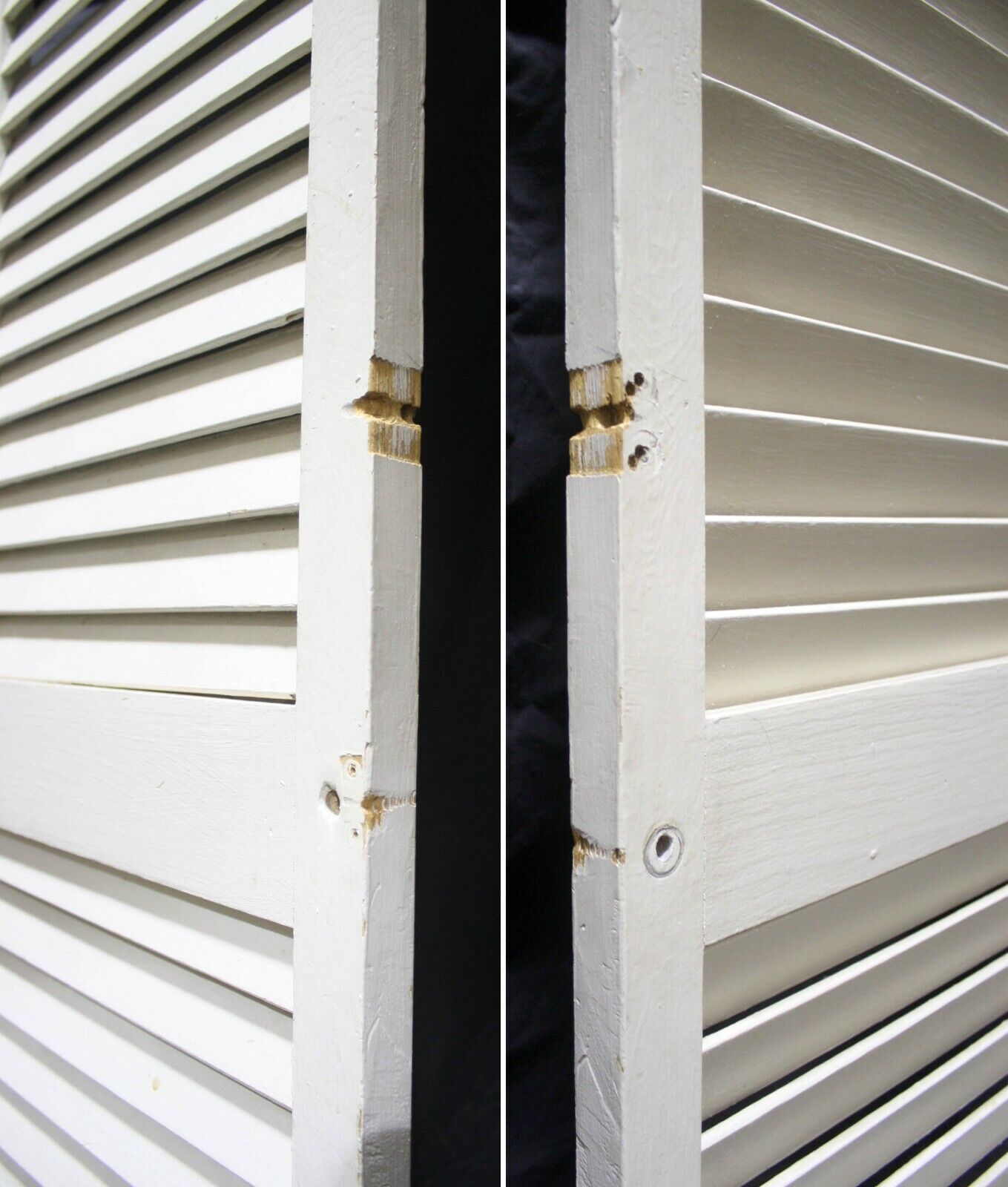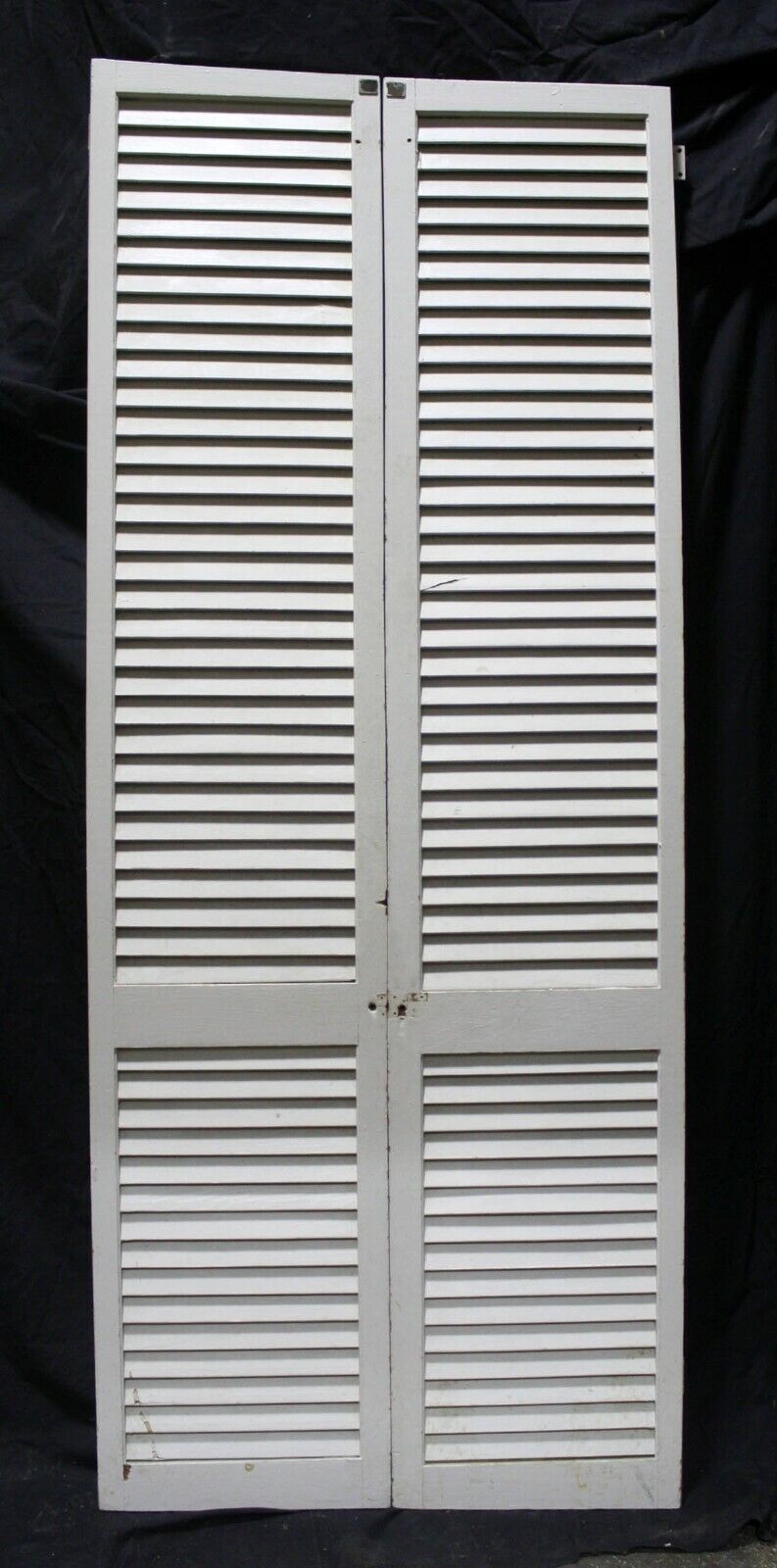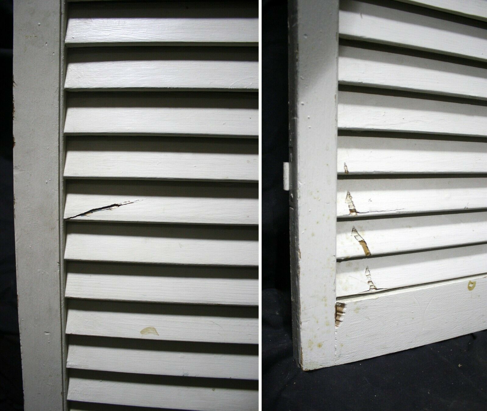 Condition: The last 4 photos show the worst blemishes the doors have. The last photo shows both sides of a repaired louver. The 2nd to last photo shows a cracked louver and a couple of scraped louvers, and the other 2 just show holes and scrapes where the original hardware was installed. The crack louver is only cracked on one side, and it's not loose. Just fill the crack and holes with a combination of glue and wood putty prior to painting.