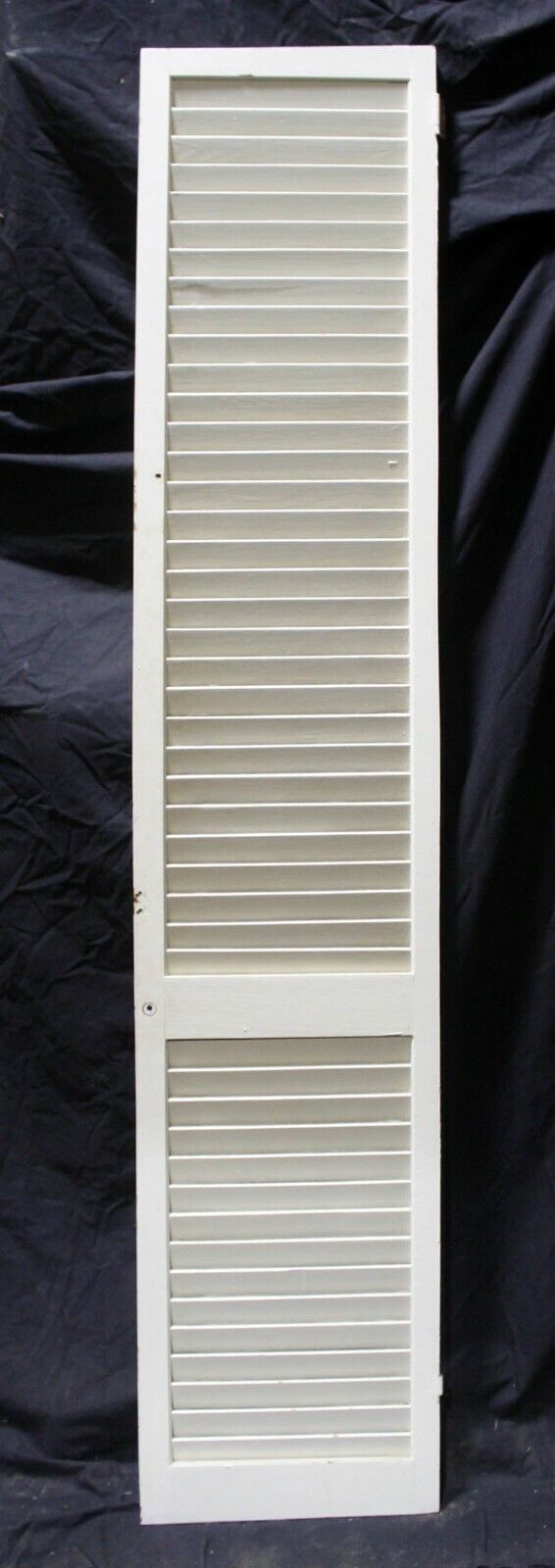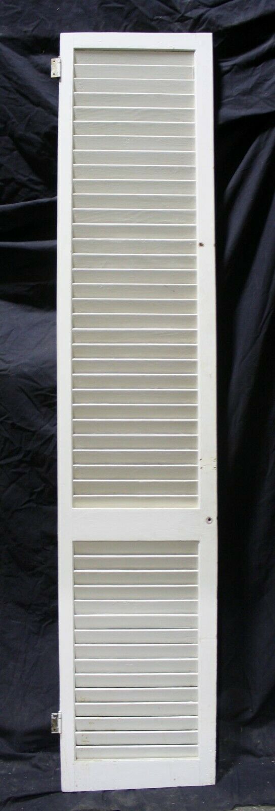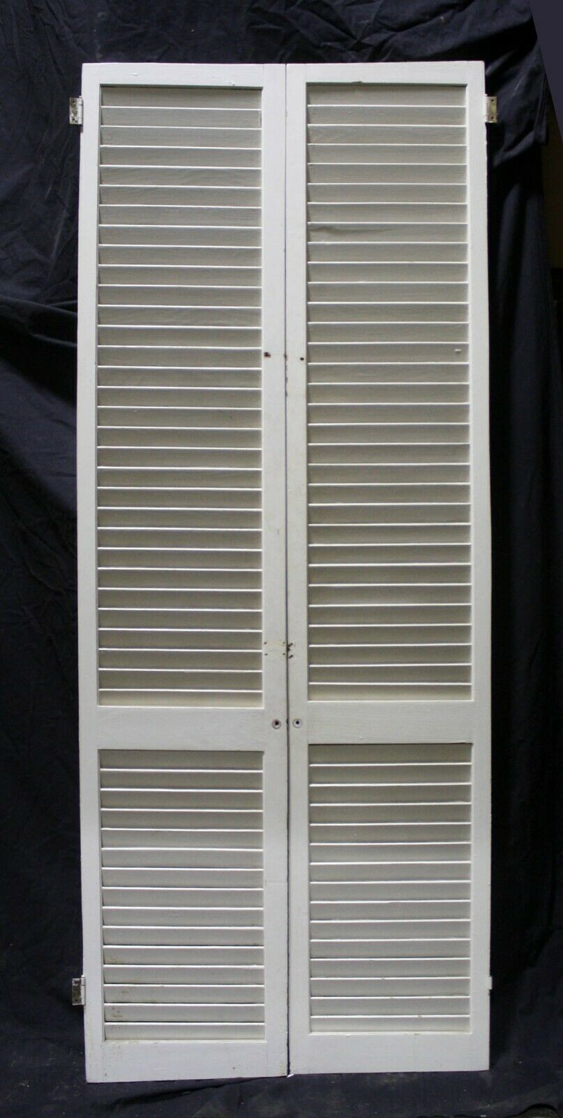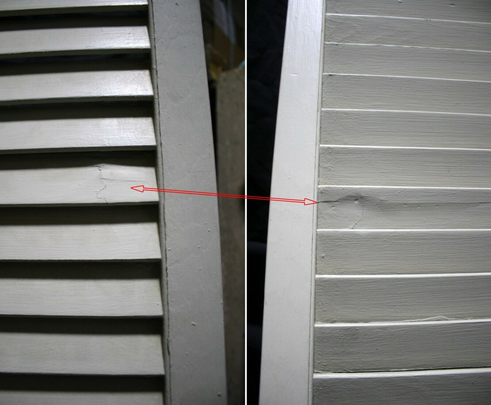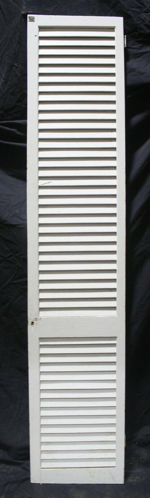 Condition: The last 4 photos show the worst blemishes the doors have. The last photo shows both sides of a repaired louver. The 2nd to last photo shows a cracked louver and a couple of scraped louvers, and the other 2 just show holes and scrapes where the original hardware was installed. The crack louver is only cracked on one side, and it's not loose. Just fill the crack and holes with a combination of glue and wood putty prior to painting.