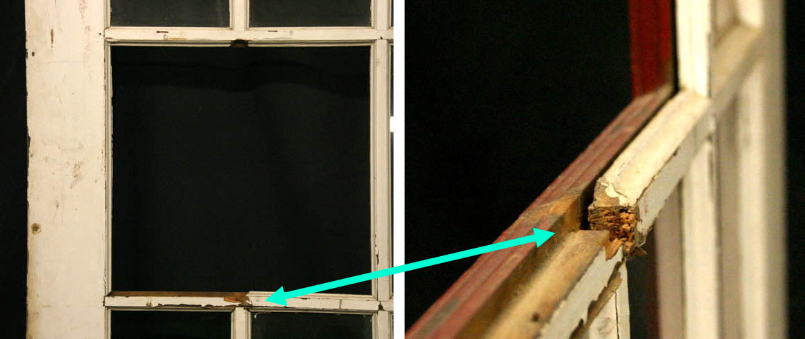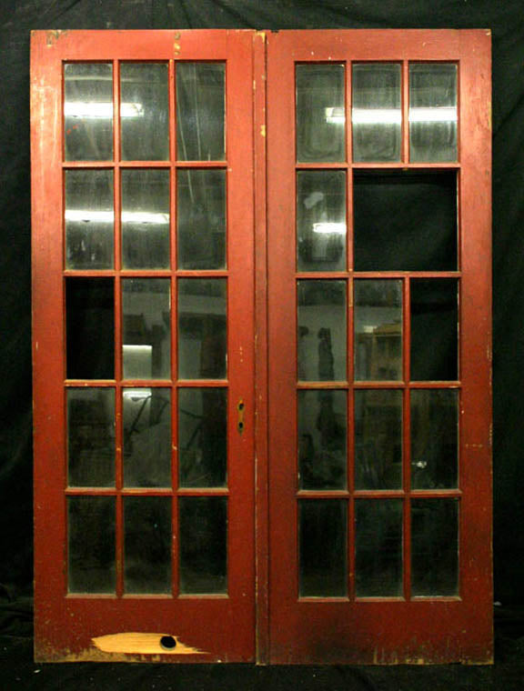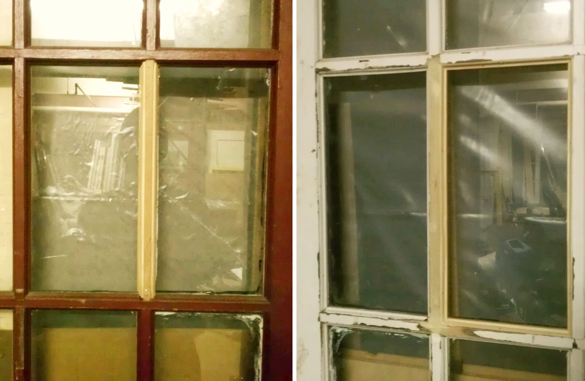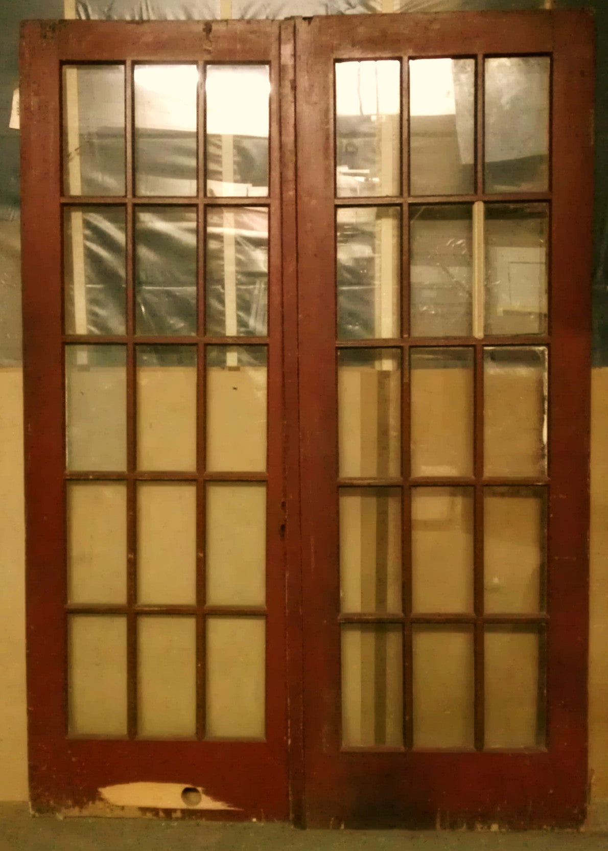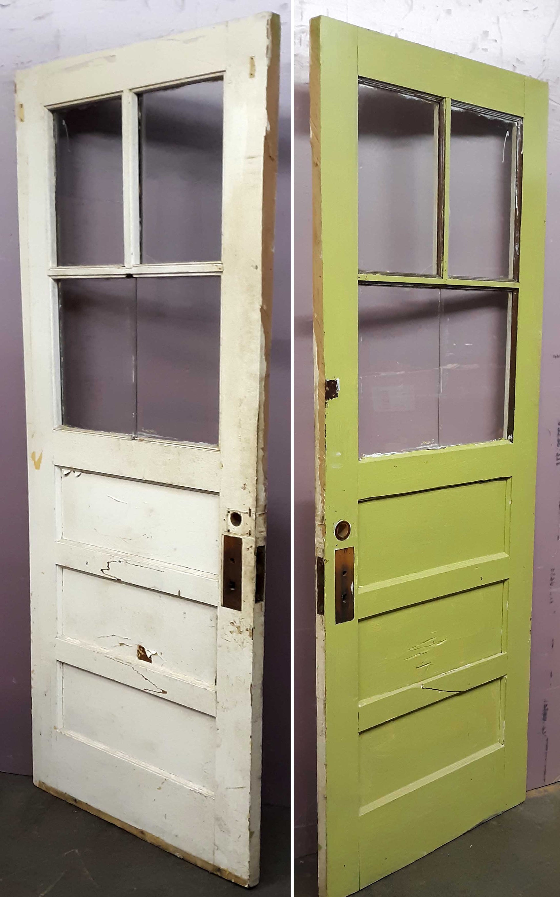 The door is supposed to have 4 true-divided windows with original glass. However, the lower vertical mullion/muntin broke off. We could make a similar mullion and add it--message us for a quote. The last 4 photos show a pair of doors that had a similar issue, which we repaired.