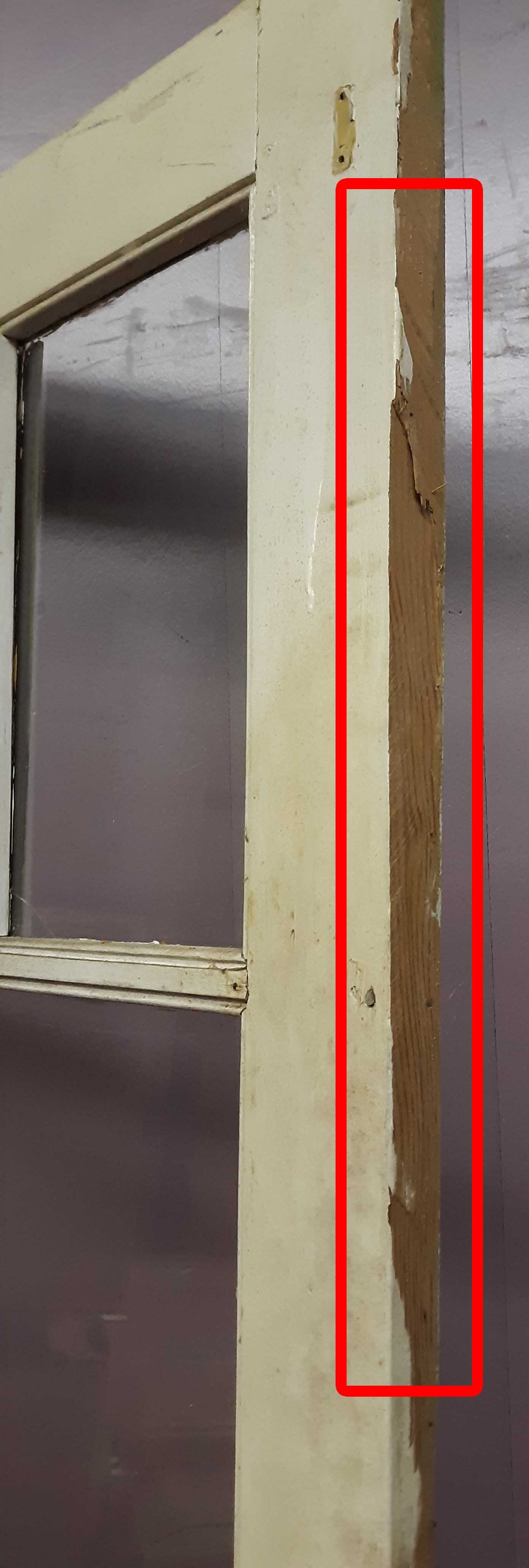 Condition: The door is strong, sturdy, and in good structural condition. It only has nicks and scratches, but no broken or cracked joints, gouges, rot, warp, or any other serious issues. The door has a break on the lock-stile (see last photo). Most of the blemishes that it has will disappear after sanding, prior to refinishing or repainting, and whatever remains will be subtle, "character marks".
