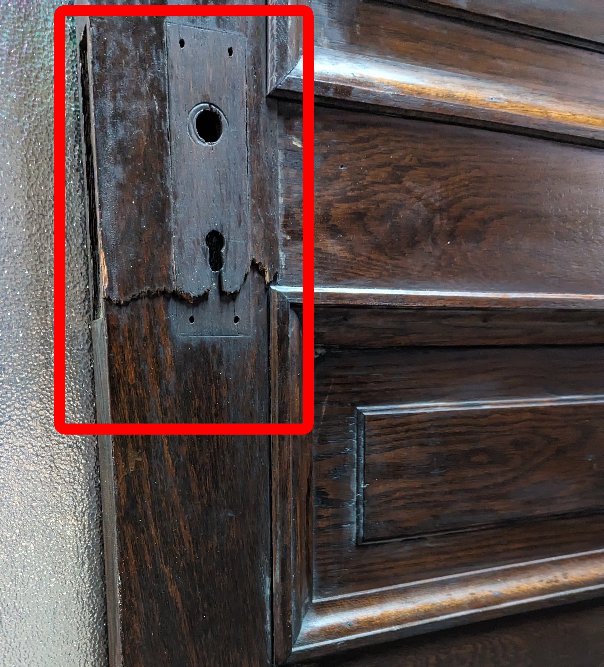 Condition: Considering the door is well over 100 years old, it is strong, sturdy and in great condition. It only has nicks and scratches, but no broken or cracked joints, gouges or any other serious issues. The door has a break on the lock-housing (see last photo). Most of the blemishes that it has will disappear after sanding, prior to refinishing or repainting, and whatever remains will be subtle, "character marks".