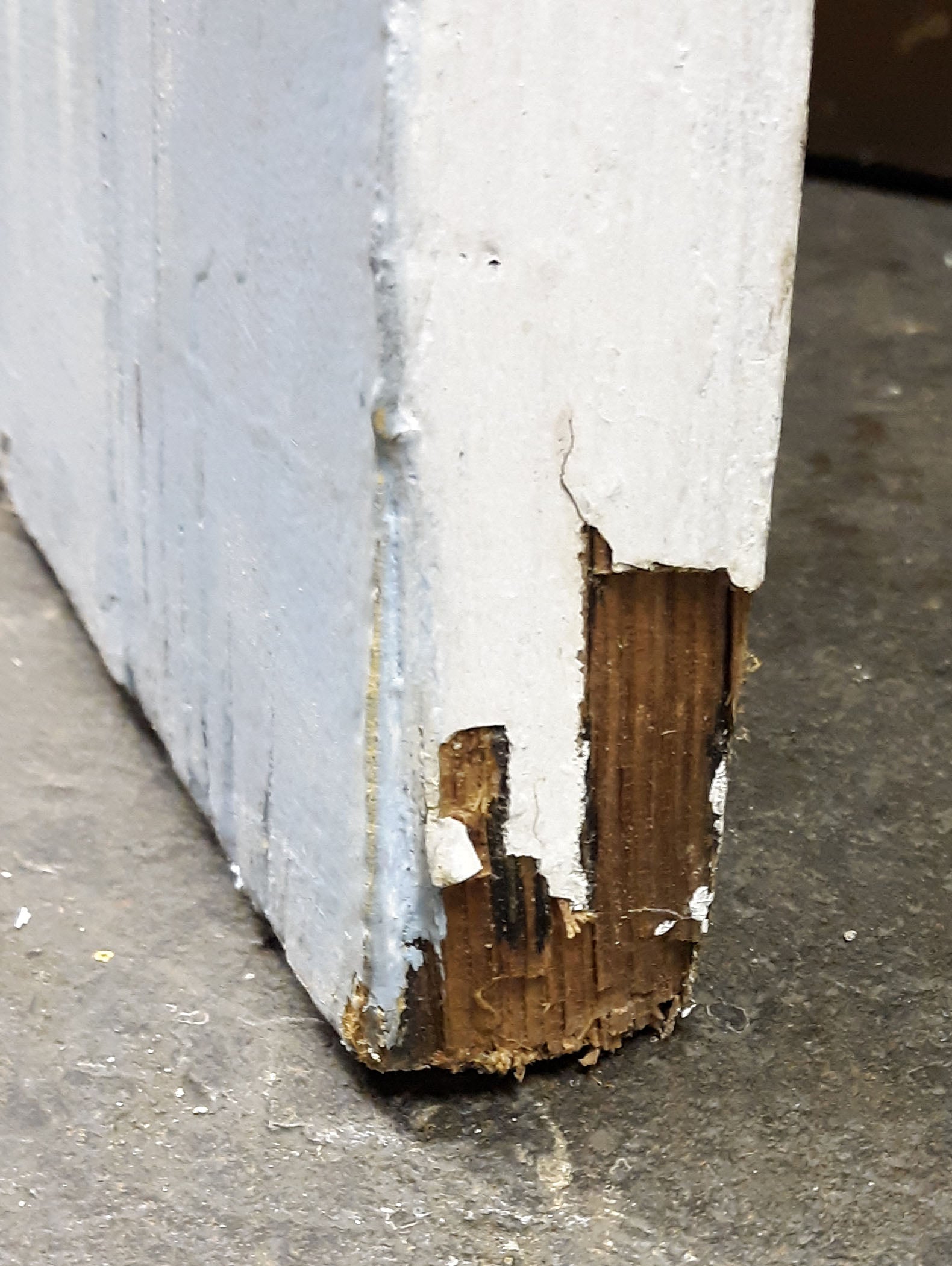Uneven Width: The door was unevenly cut by 1/4". The cuts were most likely made to compensate for a warped floor or sagging foundation. We could cut the door to an even height/width, build it up to be taller/wider, or even cut it to be narrower/shorter--message us for a quote.