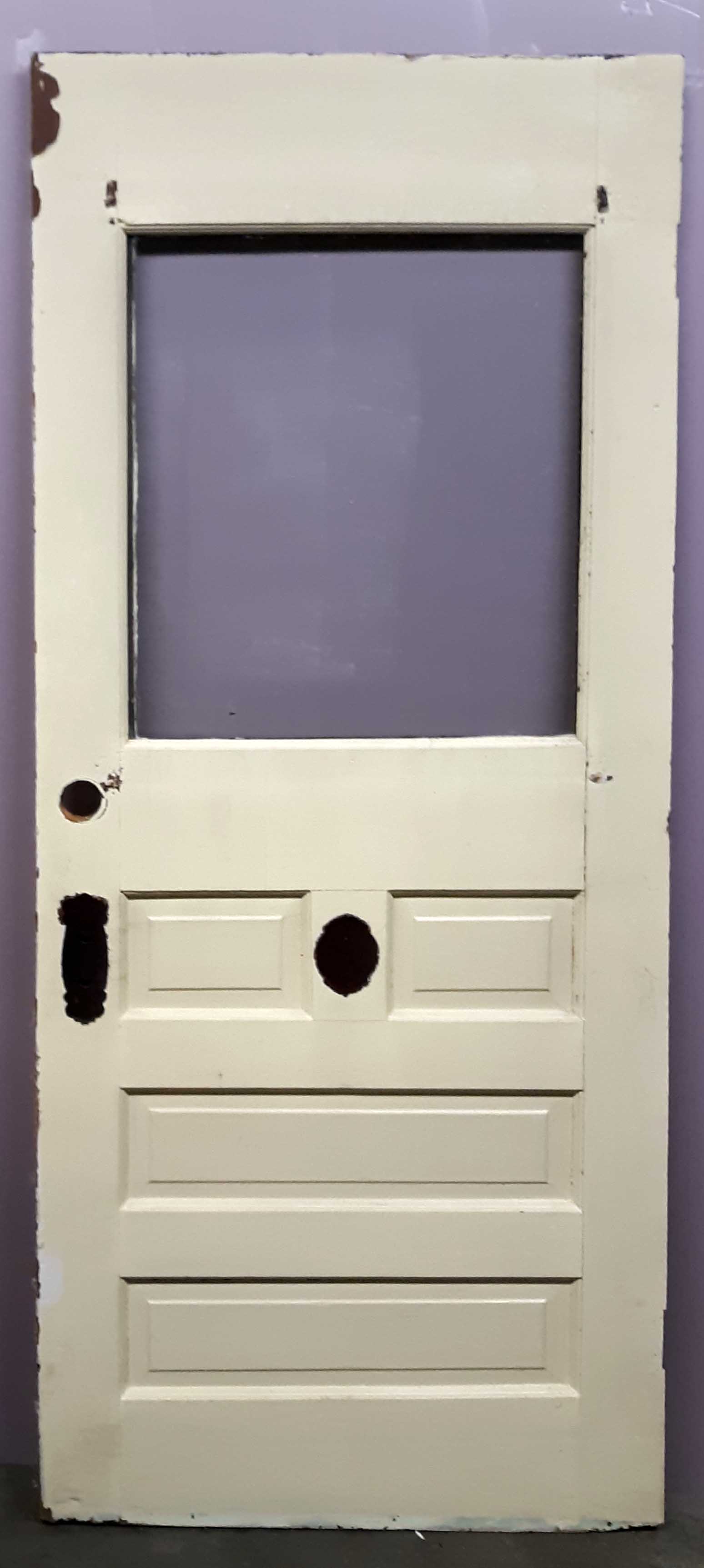 The door has a window with clear, old, wavy glass and 4 raised panels below.