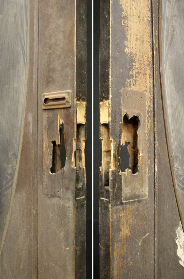 Condition: The door is strong, sturdy, and in great structural condition. It only has nicks and scratches, but no broken or cracked joints, gouges, rot, warp, or any other serious issues. The worst blemishes are some warped or bubbling veneer, which is caused by moisture loosening the veneer from the core wood. Since the glue used back in the day was made from animal sinew, its not water resistance like modern glue. To fix this issue, the veneer needs to be lifted enough to clean and sand underneath, and then glued and clamped to flatten out. We could do this--message us for a price.