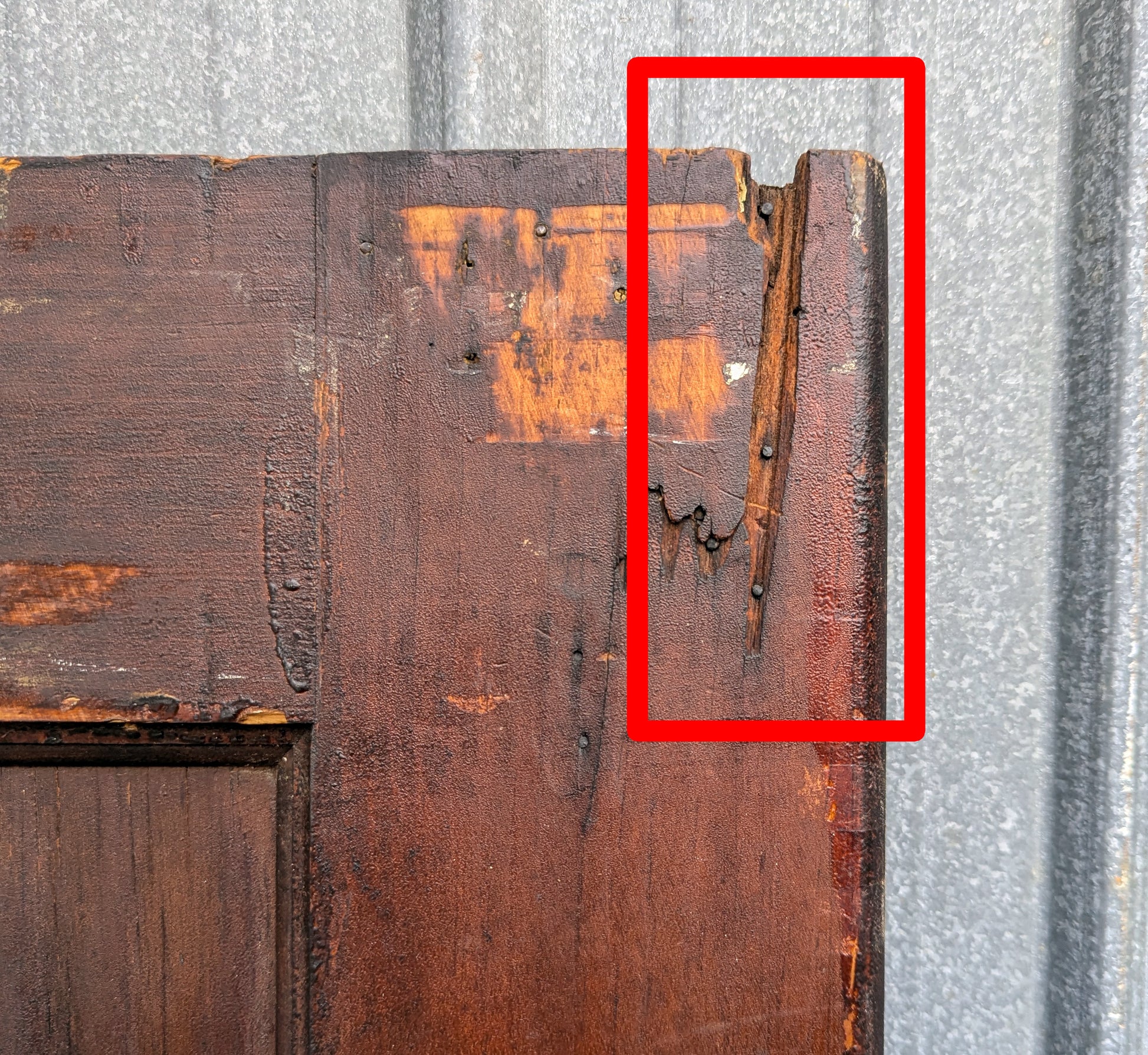 Condition: The door is strong, sturdy, and in great structural condition. It only has nicks and scratches, but no broken or cracked joints, gouges, rot, warp, or any other serious issues. The door has a small break on the top corner of the lock-stile (see 4th photo).