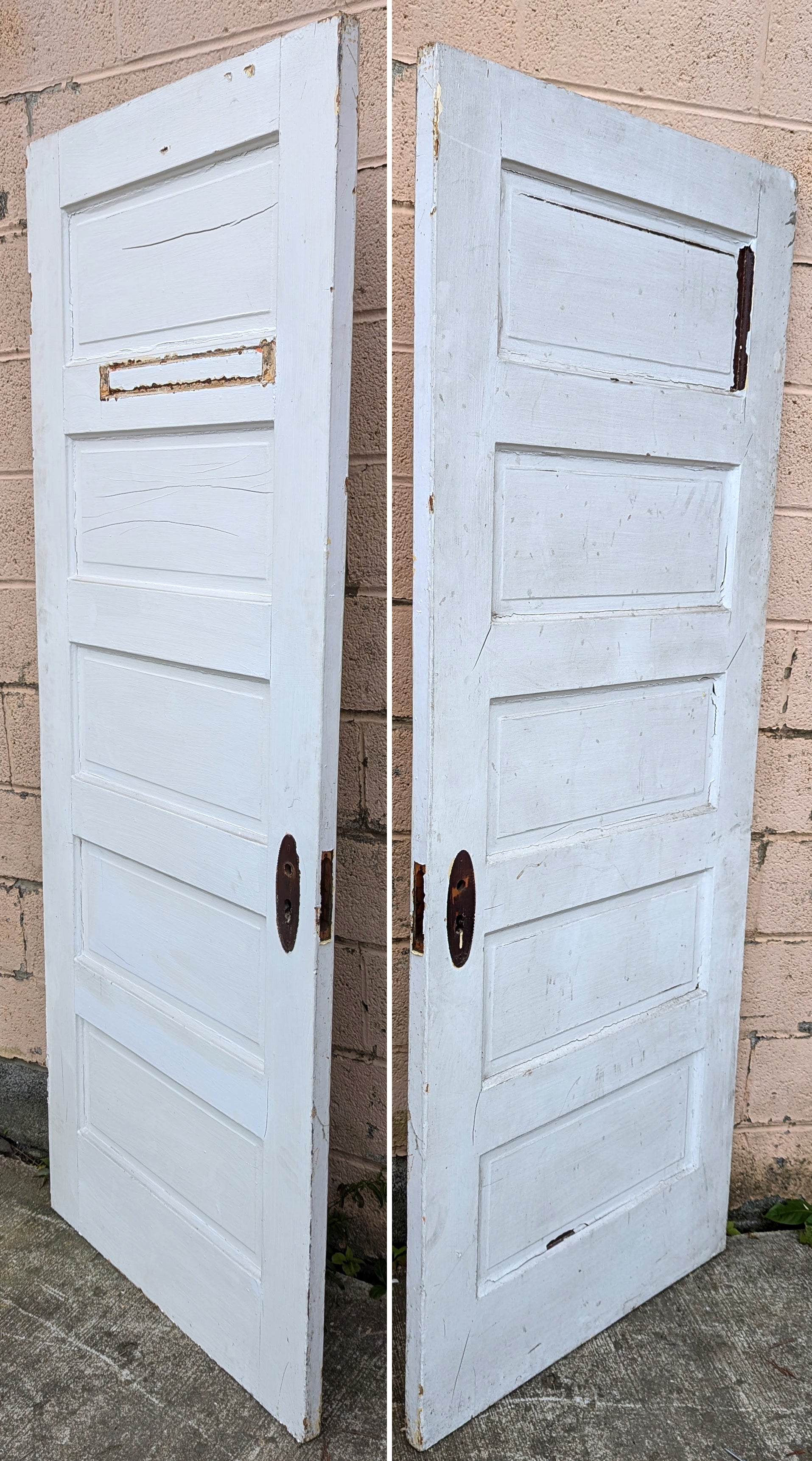 Attractive, antique interior door salvaged from an old, home in Northeastern, PA. The door is made of solid Douglas fir and has 5 raised panels on both sides. The door is painted on both sides.