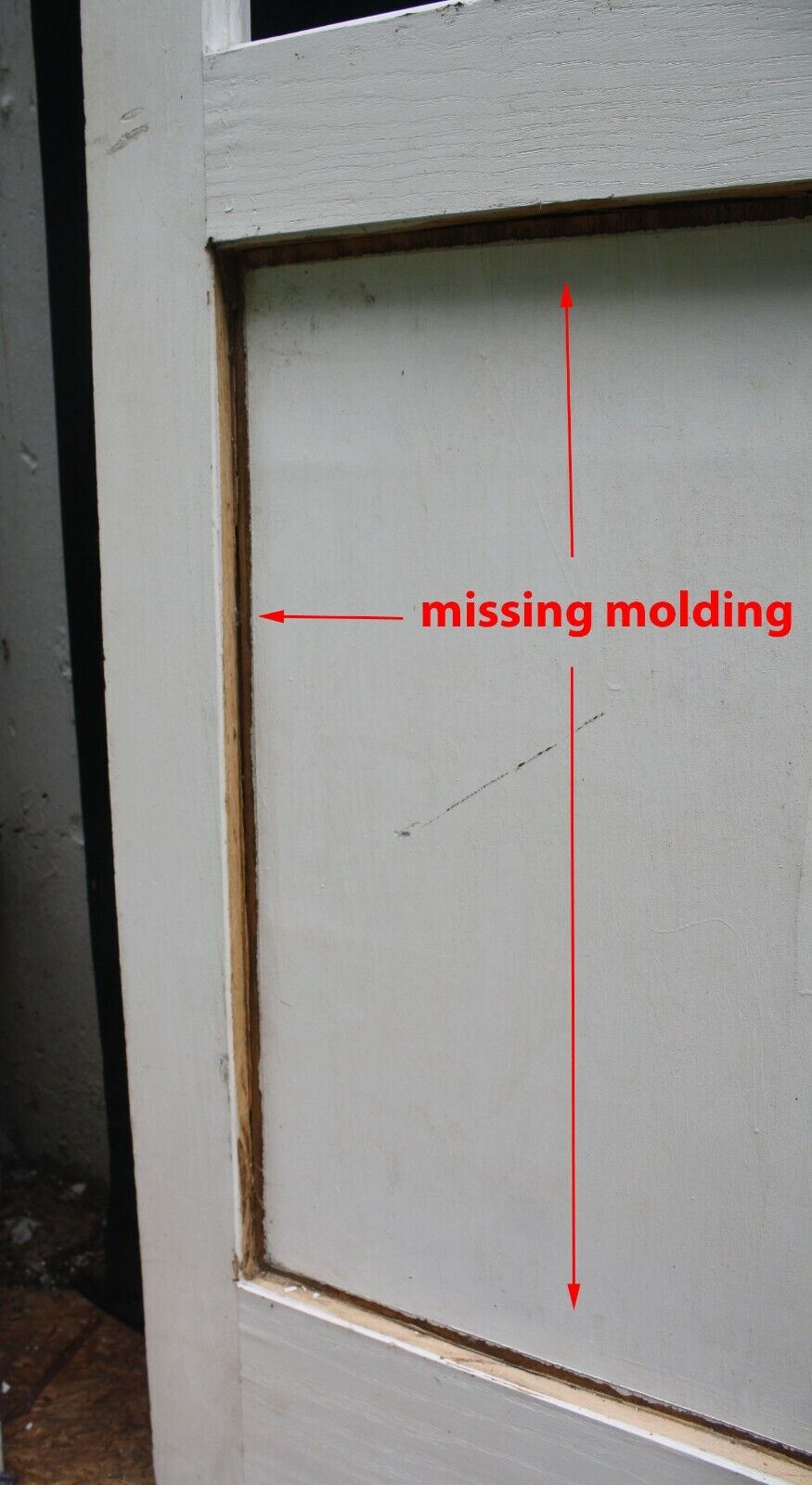One piece of removable window molding is missing and   the 8 pieces of molding from both sides of the panel were cut out to  resemble the doors in the house where the door was to be installed. The  panel is tight, but some molding should be added to ensure that it  remains tight over time. You could get molding and install it yourself  or we could make and install--email  us for a quote.
