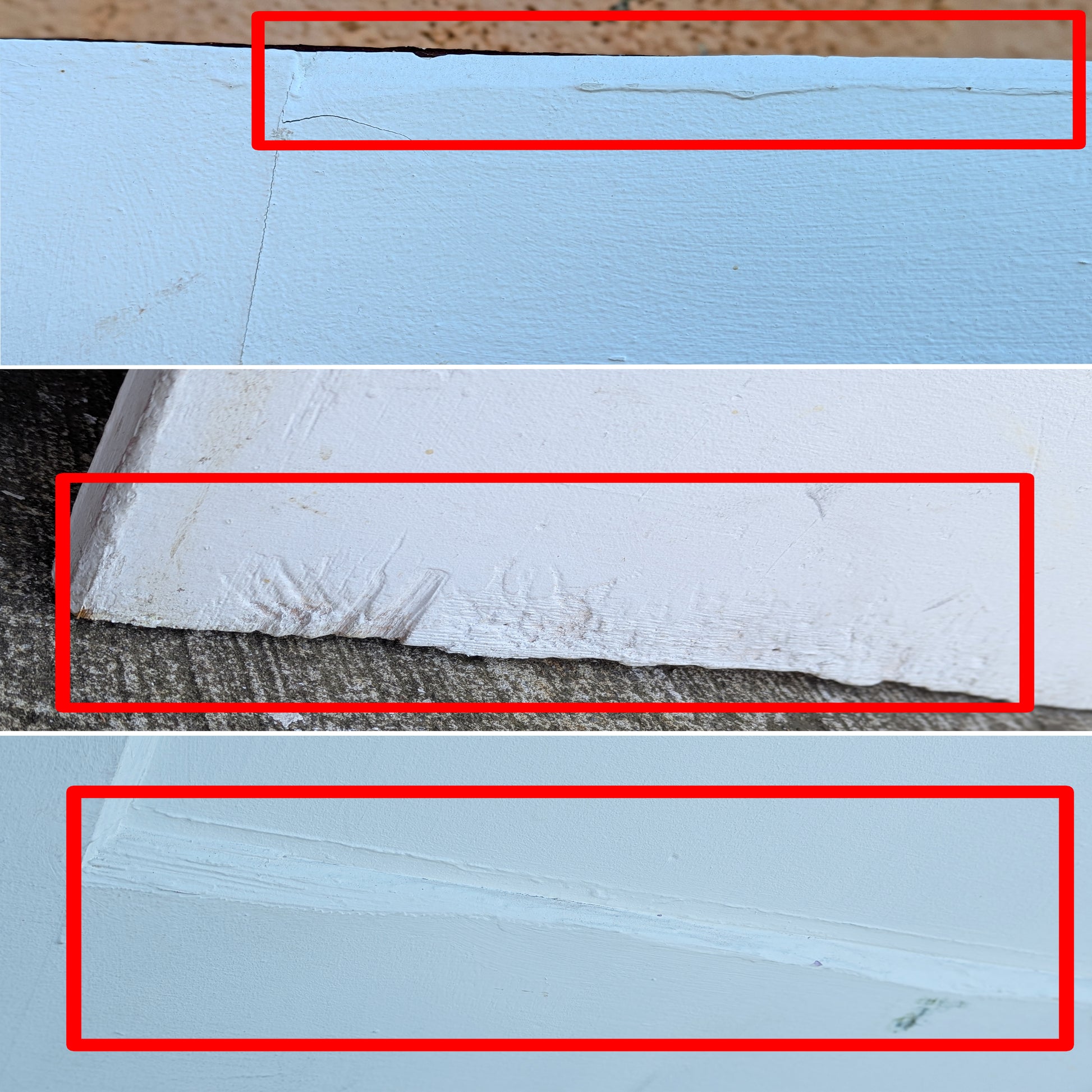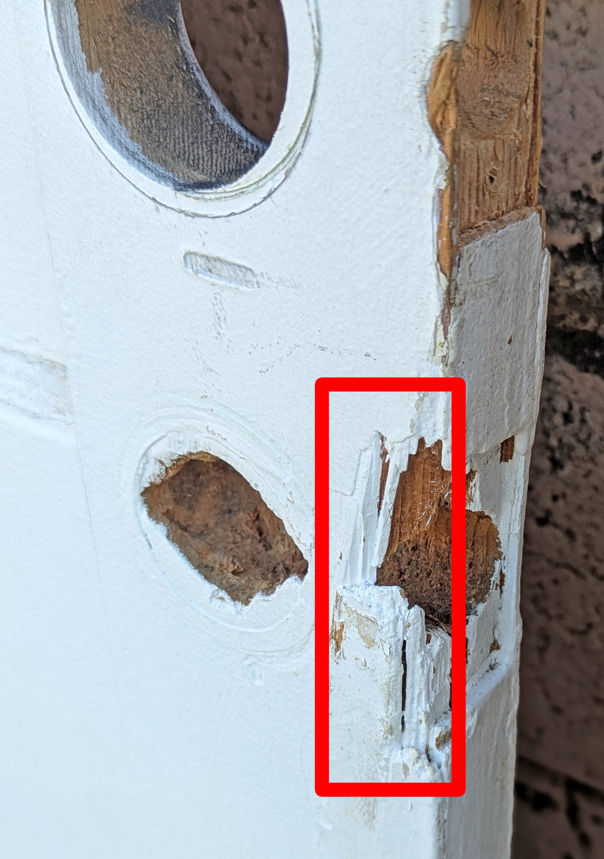 Condition: All of the doors are structurally sound and sturdy. There are a the expected nicks, scrapes and scratches that you would expect to find on old used doors, but no broken or cracked joints, deep gouges, rot or warp. Door#2 has a small break on the lock-housing (see 4th photo). There were also 3 smaller pieces of damage on one of the other doors in the lot (see last photo). Most of the blemishes that they have will disappear after sanding, prior to refinishing or repainting, and whatever remains will be subtle, "character marks".
