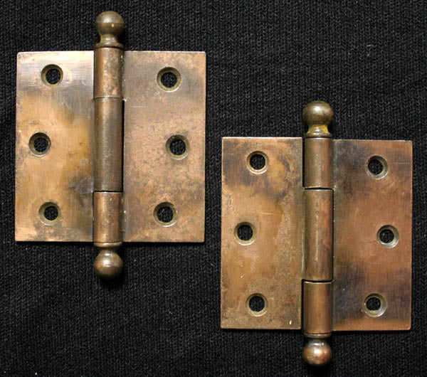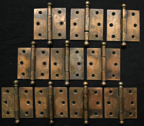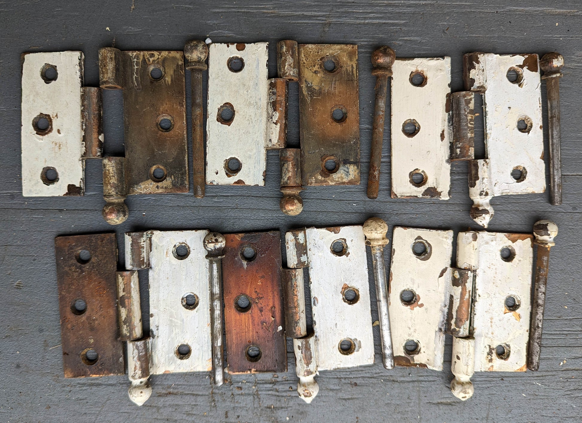 We removed the hinges from various doors that we salvaged from Northeastern PA. At the point of salvage, the hinges were painted, dirty, and  rusty (see last photo). Since then, we removed the paint, and cleaned them to the best of our ability.