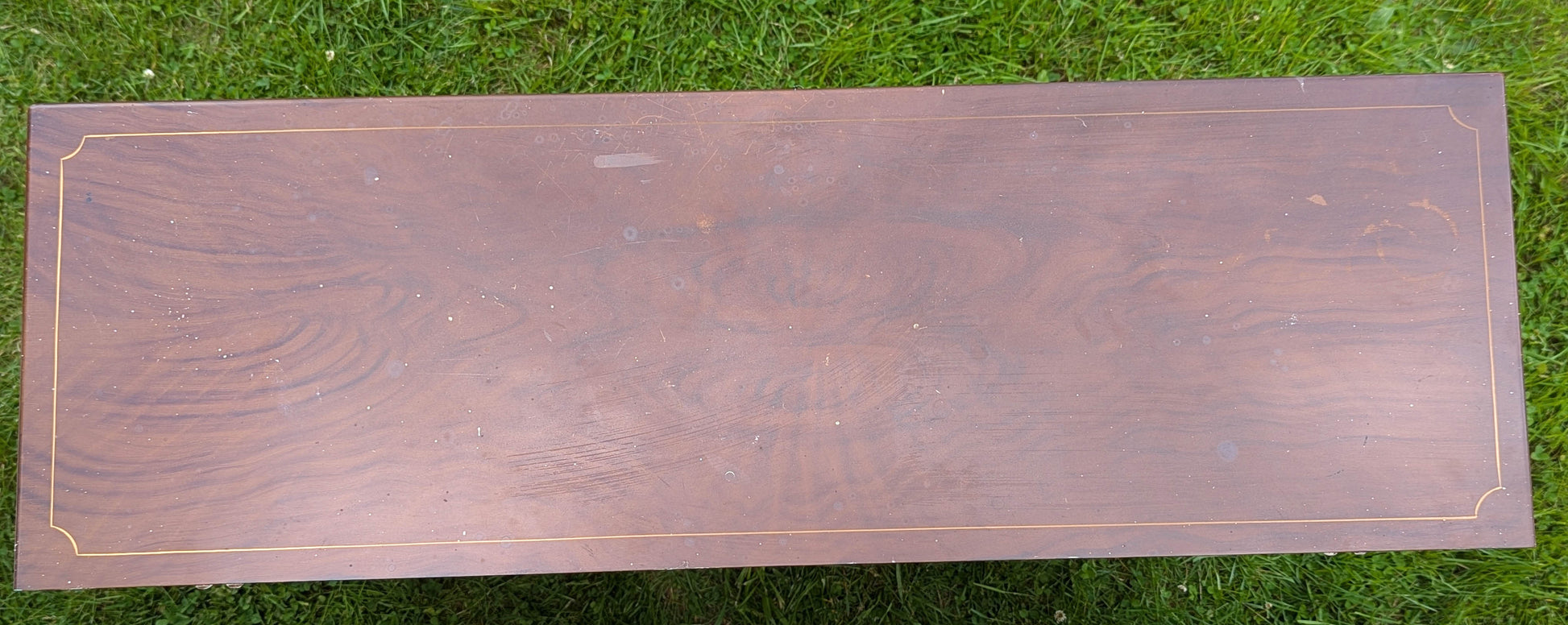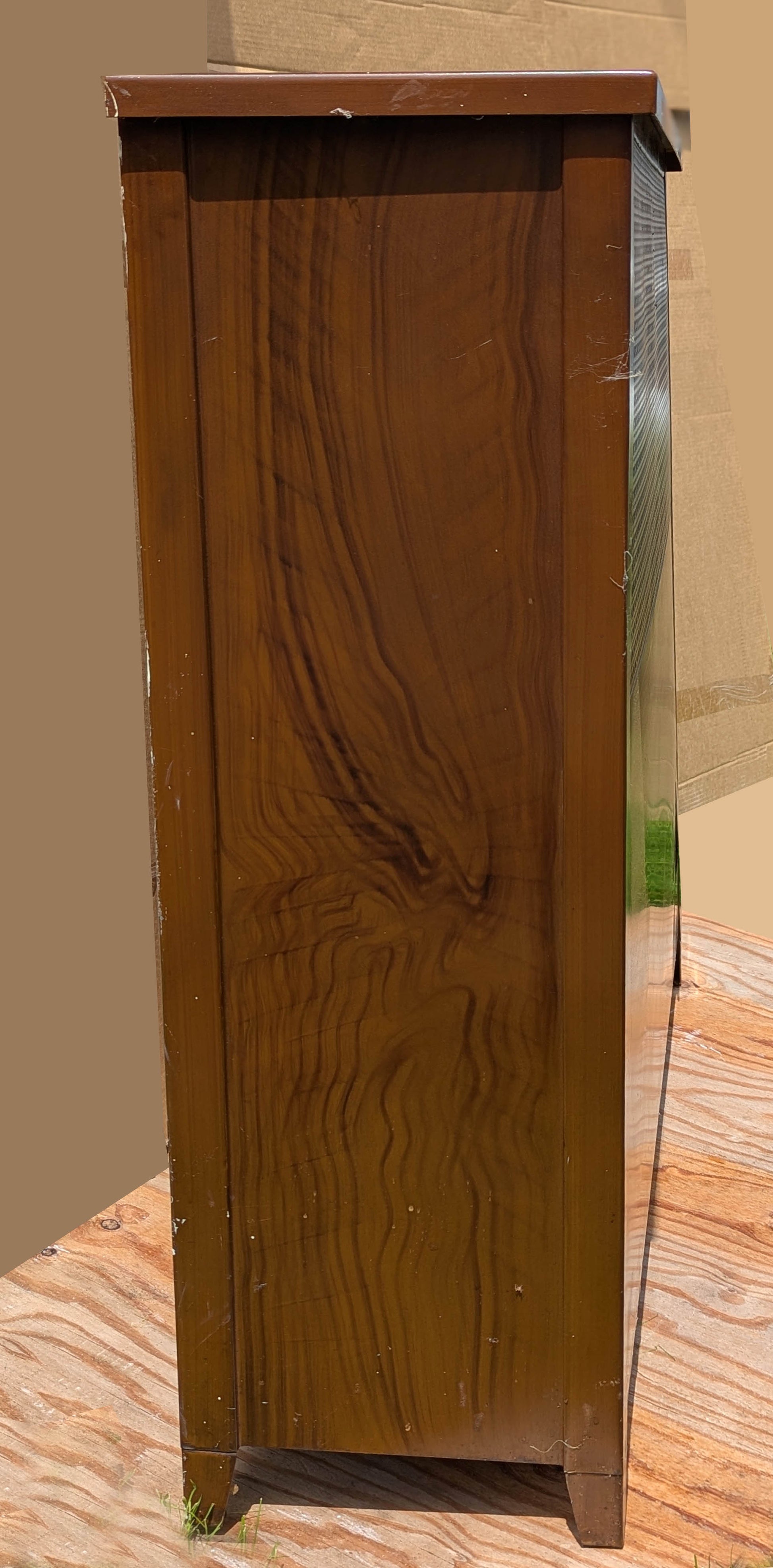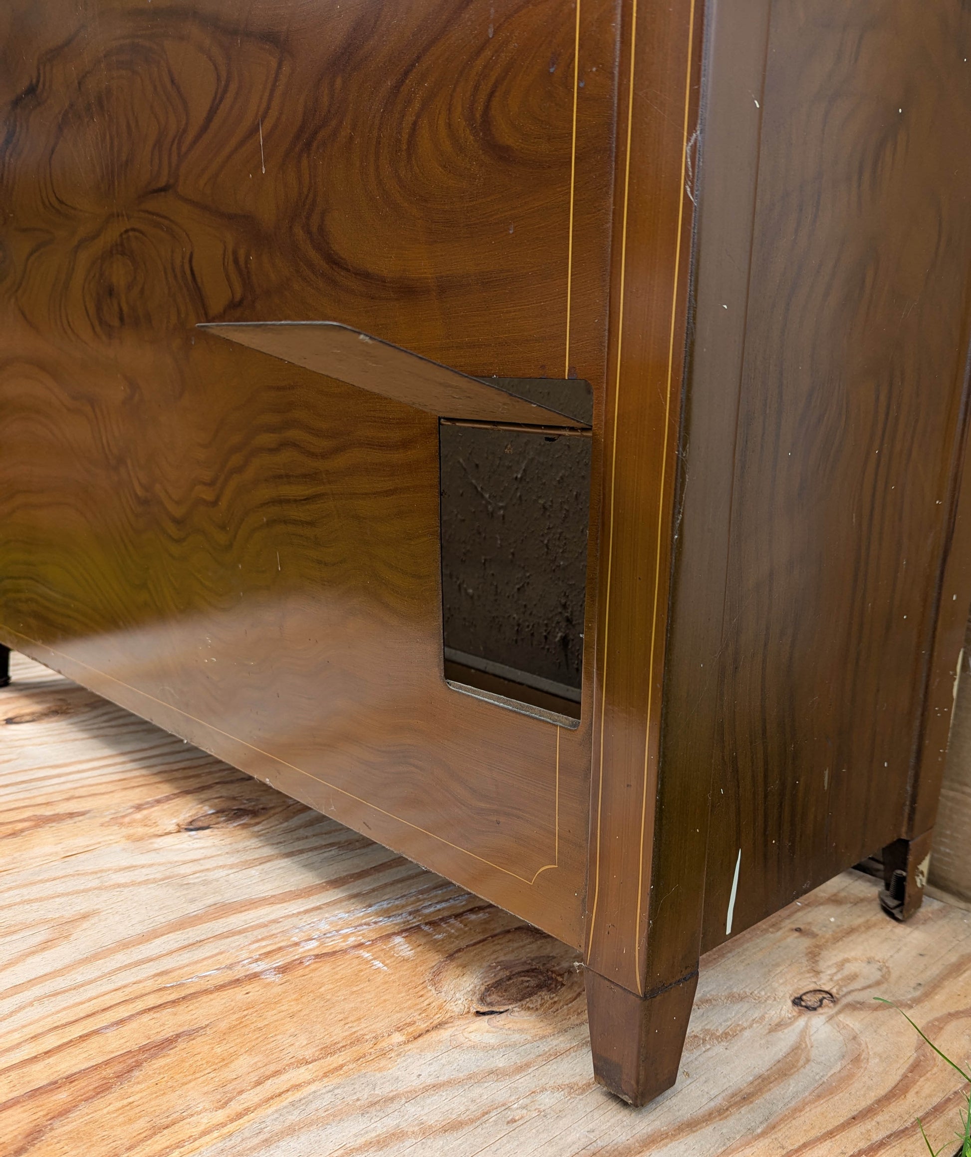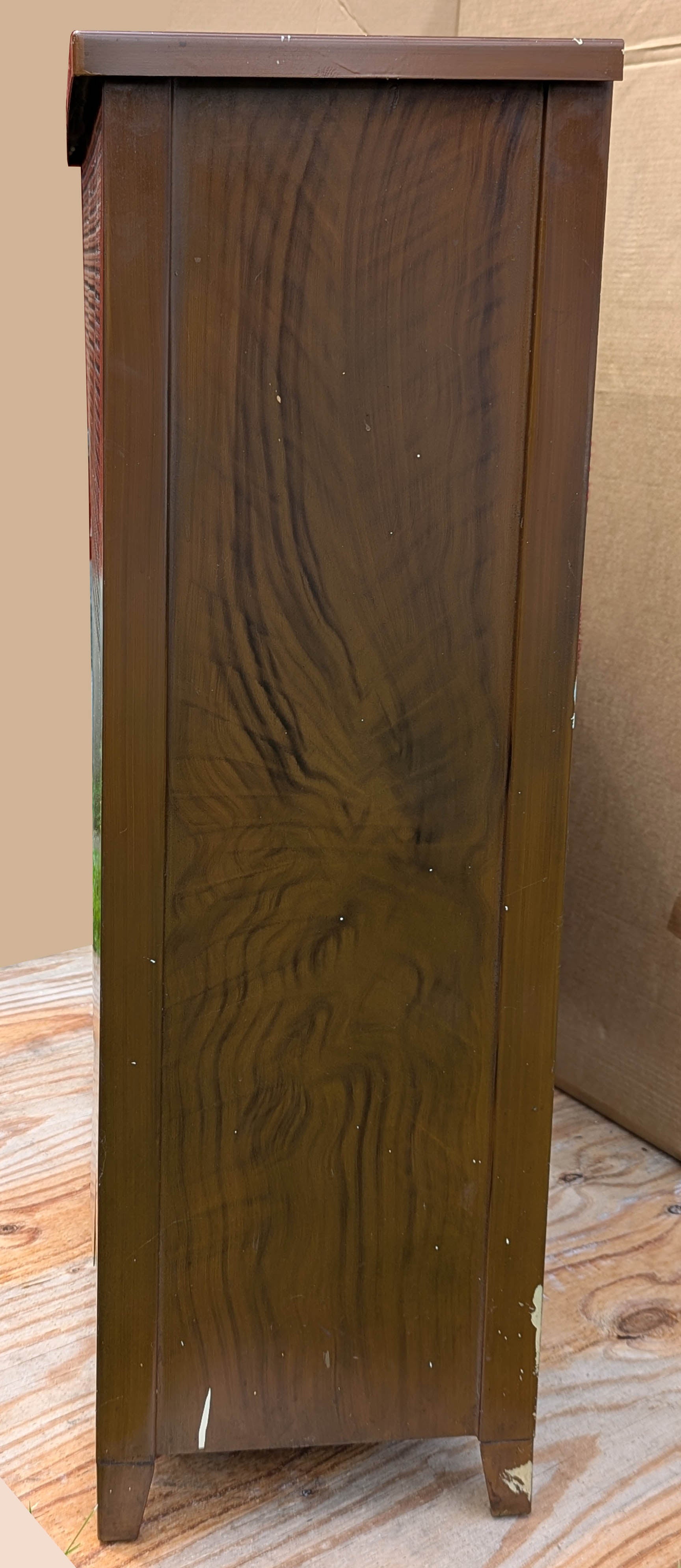 The cabinet is in great condition, with no dents, deep scratches, breaks, cracks, or gouges. Just expect nicks, scratches, and some spots of white paint here and there. The finish and painted design are in also in good shape. It's ready for another lifetime of service.
