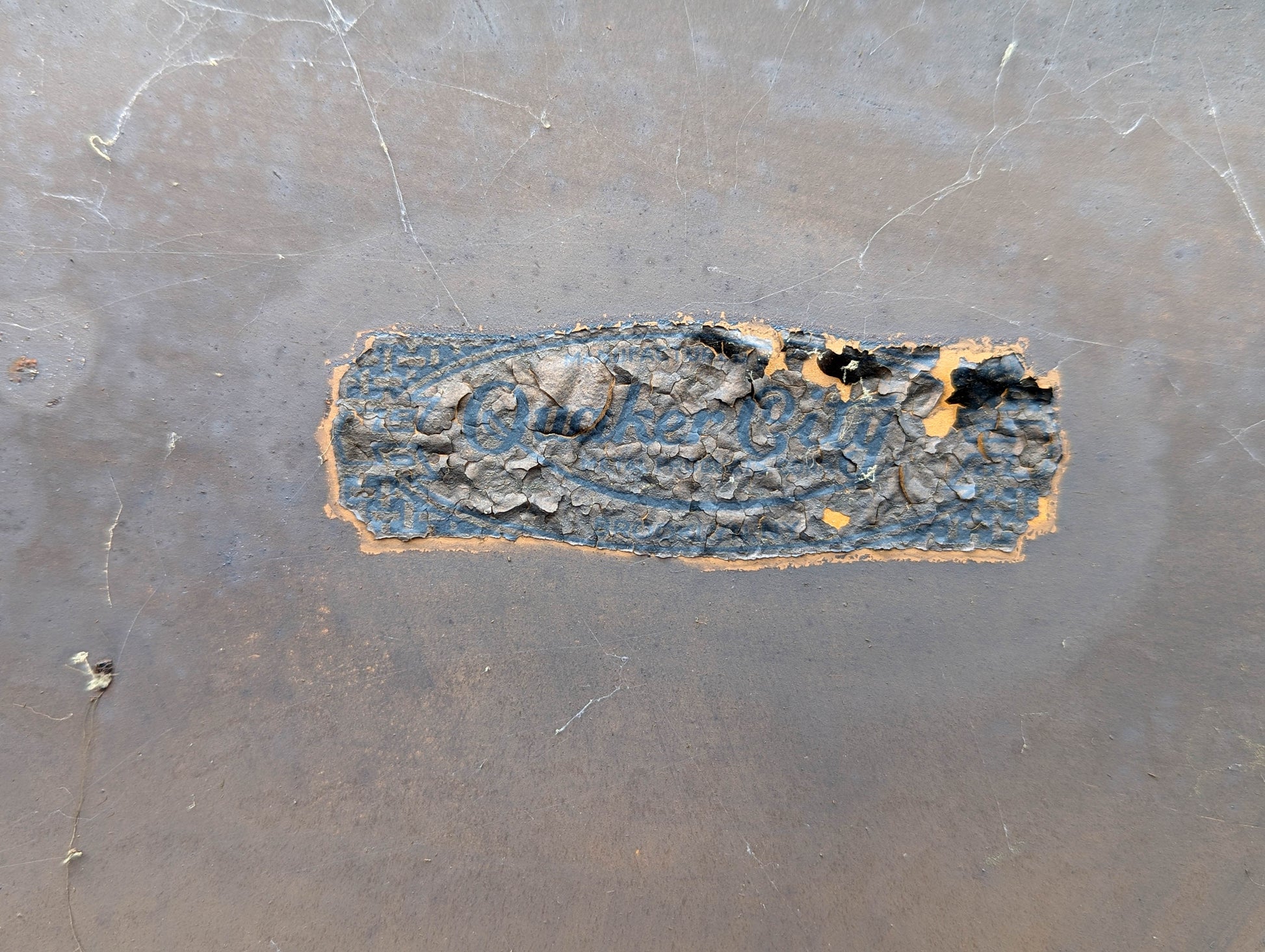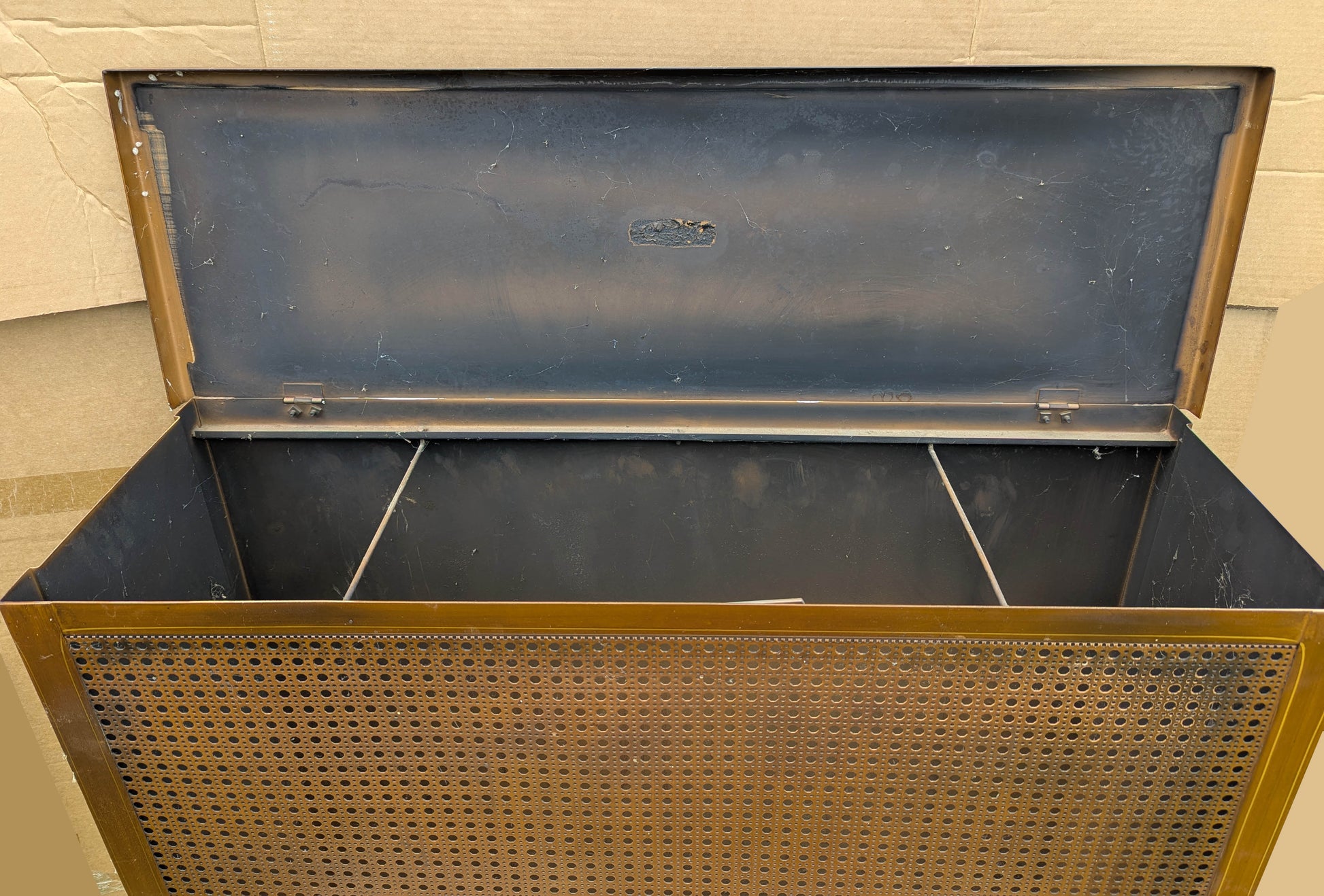 The top is hinged and lifts up. The label is a bit charred and hard to read but still legible if you look closely.