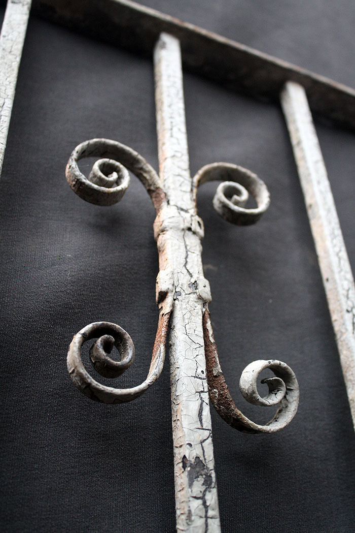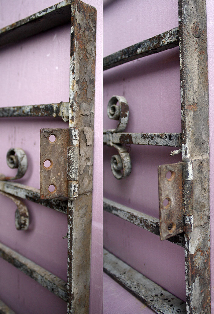 Beautiful, metal gate salvaged from Northeastern, PA. It's made of solid iron or steel, and weighs 27 lbs. There are 13 straight spindles from side to side (or top to bottom if you plan on installing it vertically), and the 2nd spindle from either side has 4 decorative volutes (spirals or curlicues). It has hinges on one side and a hasp with padlock on the other.
