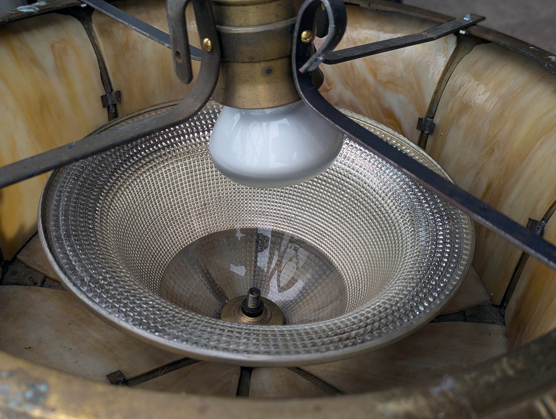 The gentleman that we bought it from got it from a local church years ago. He got it in 2 pieces: the main, round section with glass panels and the portion that holds the lightbulb. He had a fabricator attach 4 steel strips/bars to connect the 2 parts. These strips/bars are clearly shown in the last 3 photos.