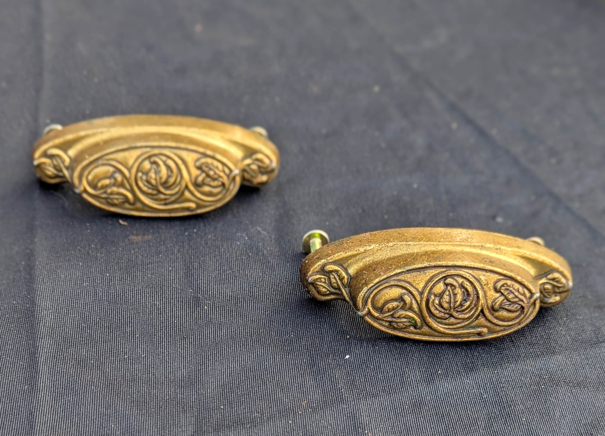 Elegant, vintage, dresser drawer pulls made by the famous, "Keeler Brass Company," of Grand Rapids, MI circa 1998. The handles are made of solid brass and each comes with 2 setscrews to secure to the drawer front.
