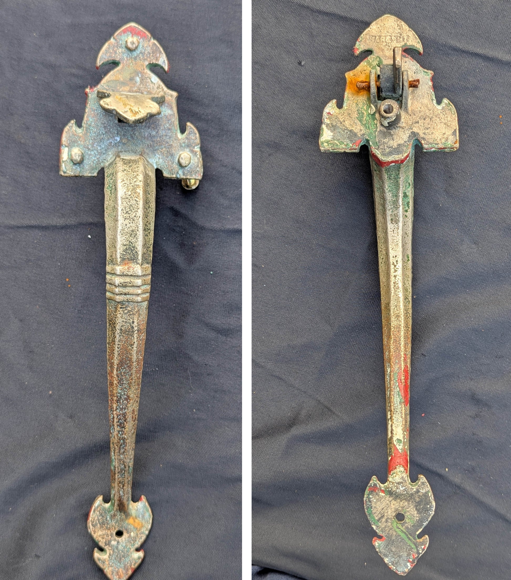 The handle not only has a cool, Neo-Classical design, but is also embellished with a combination of worn nickel plating, tarnished nickel and brass, and spots of red and green paint that came from the door that we pulled it from. If you prefer your hardware bright and shiny, it could be cleaned to a brilliant shine with some "Brasso" and #00 grade steel wool.