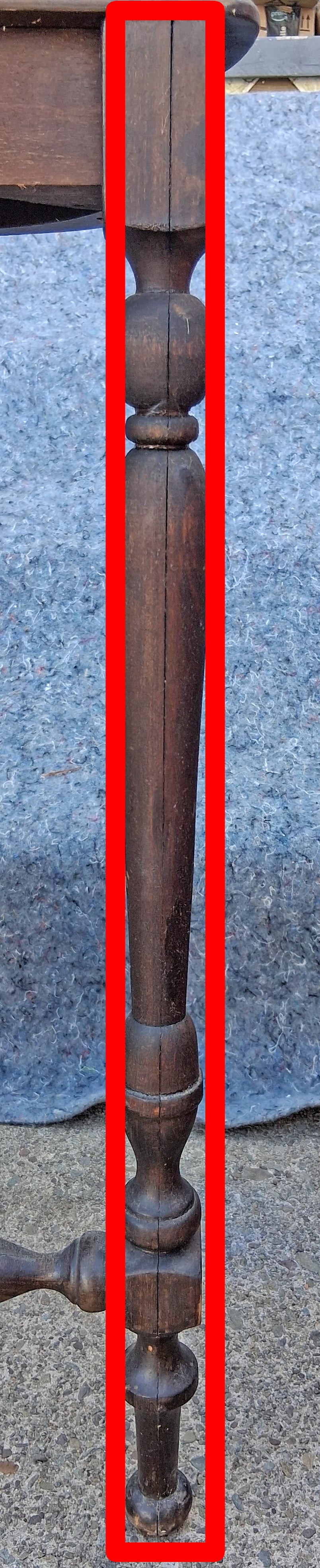 Since the table is over 100 years old, damage is to be expected. However, besides a small hairline-sized separation on one of the back legs (see last photo), there isn't any noteable damage to report. The separation also doesn't pose a threat to the structural integrity of the piece.