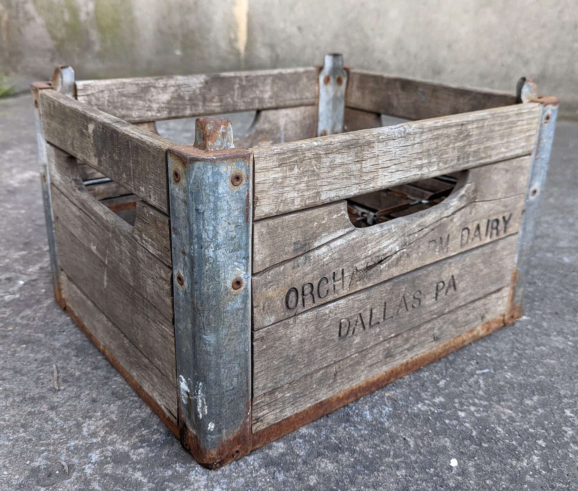 Antique Vintage Old Primitive Distressed Wood Wooden Metal "Orchard Farm Dairy" Dallas PA Pennsylvania Milk Crate Box Bin Storage Decor