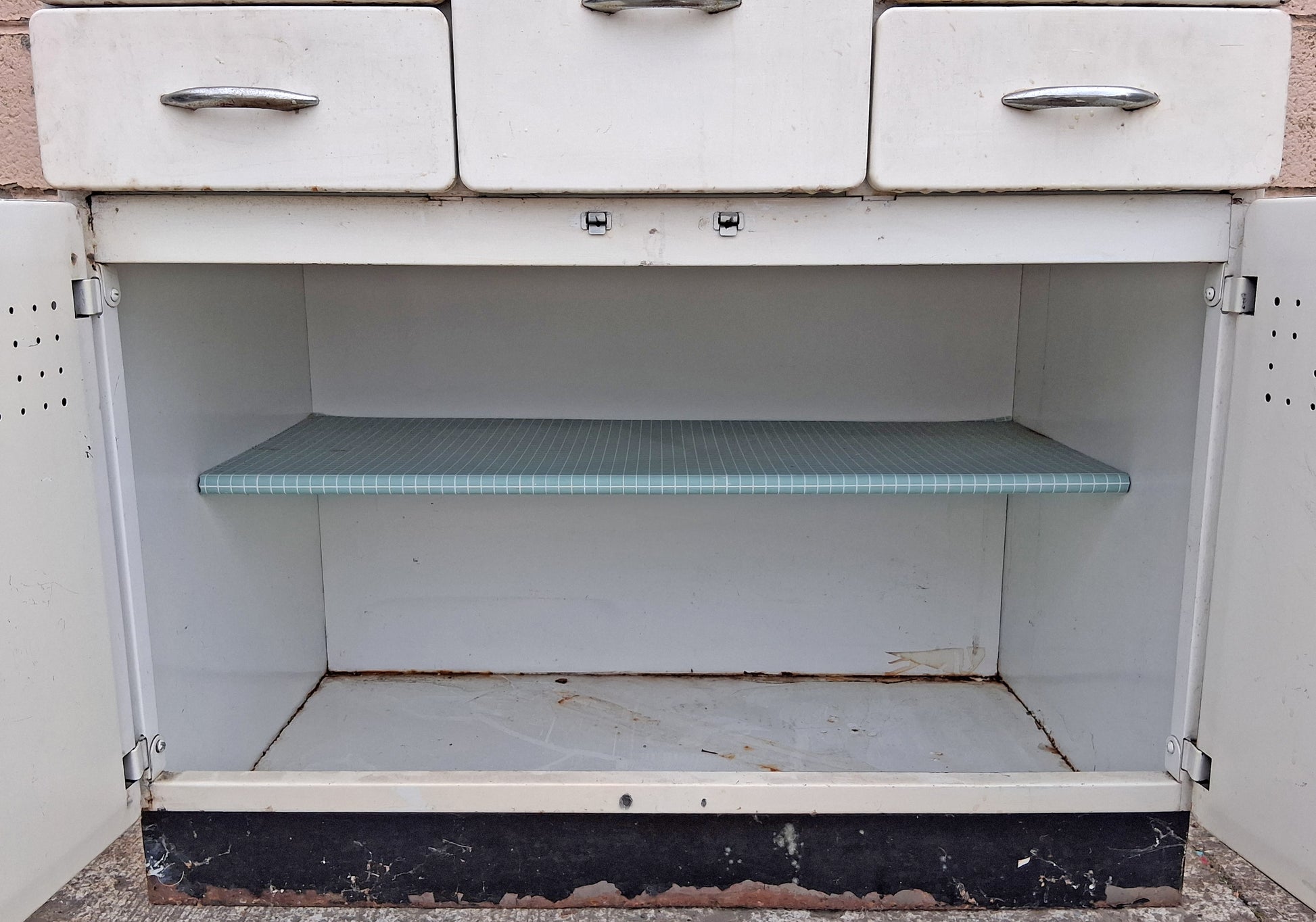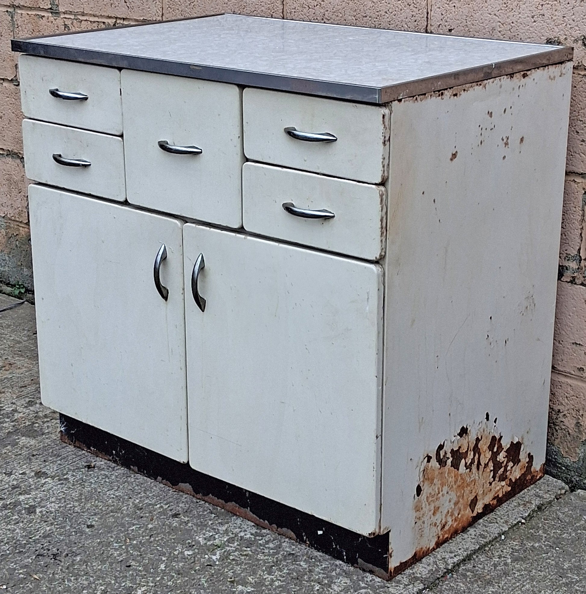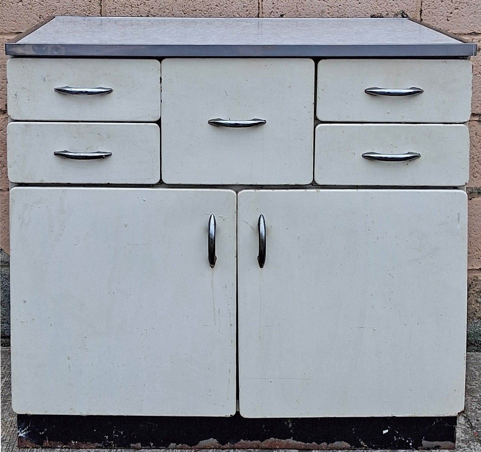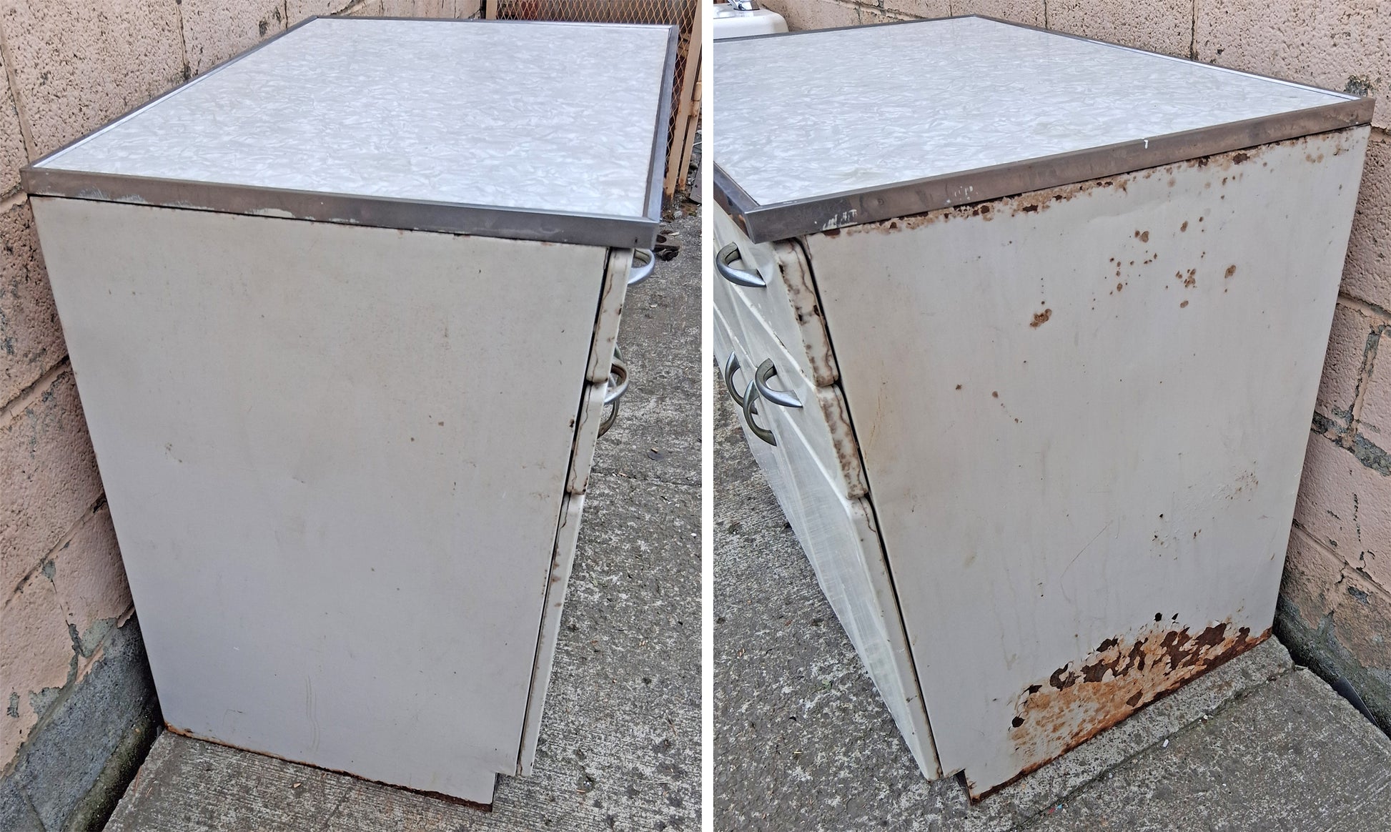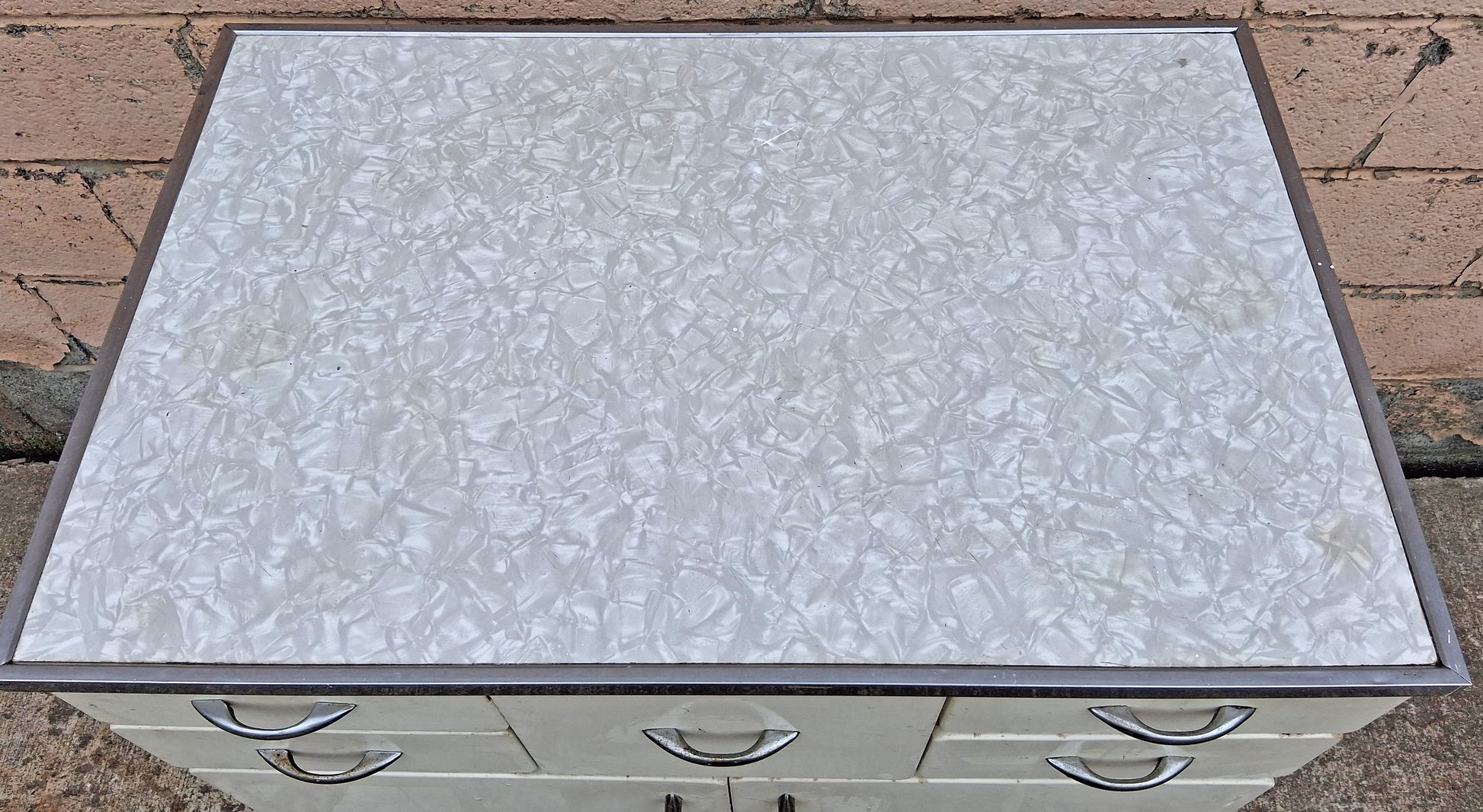 Antique Vintage Old Reclaimed Salvaged Art Deco Mid Century Modern Formica Top Metal Steel Microwave Stand Storage Kitchen Cabinet Cupboard