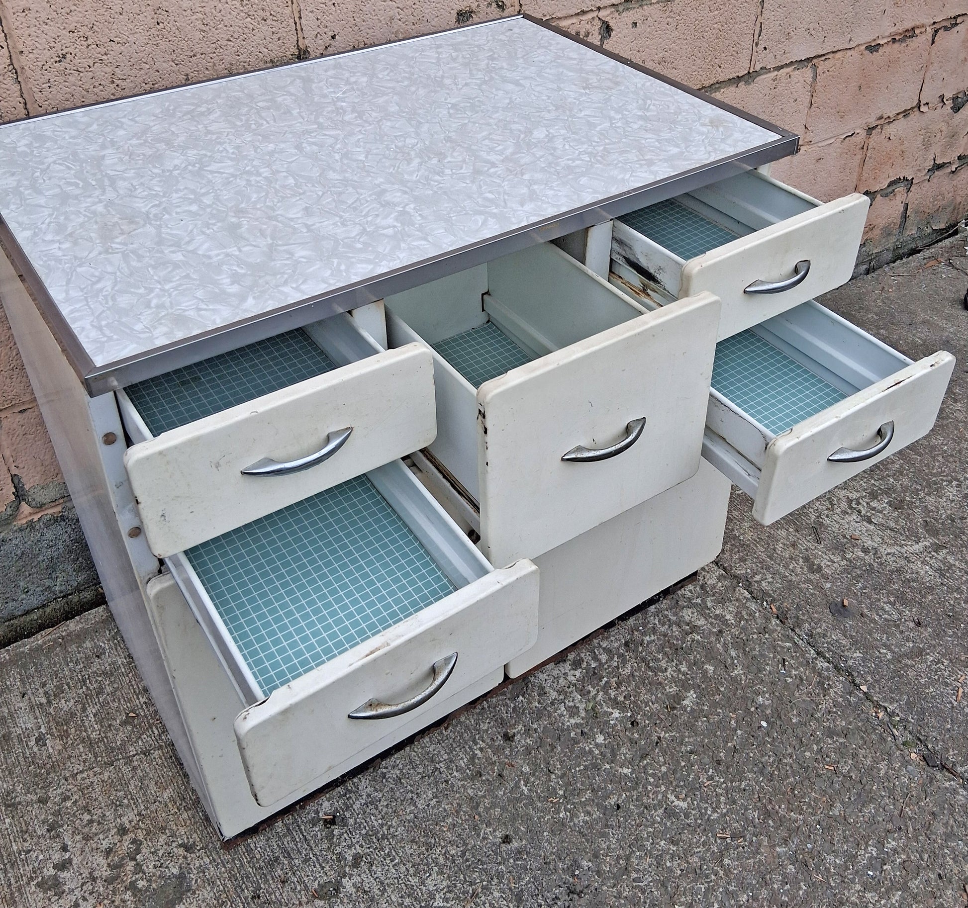 Wonderful, Art Deco, heavy-duty, metal cabinet salvaged from an old home in Scranton, PA. It is made of solid steel and is completely painted. The shelf inside the cabinet, and the inside of each drawer has a blue, grid, pattern contact paper. Notice the gorgeous "marbled" Formica top!