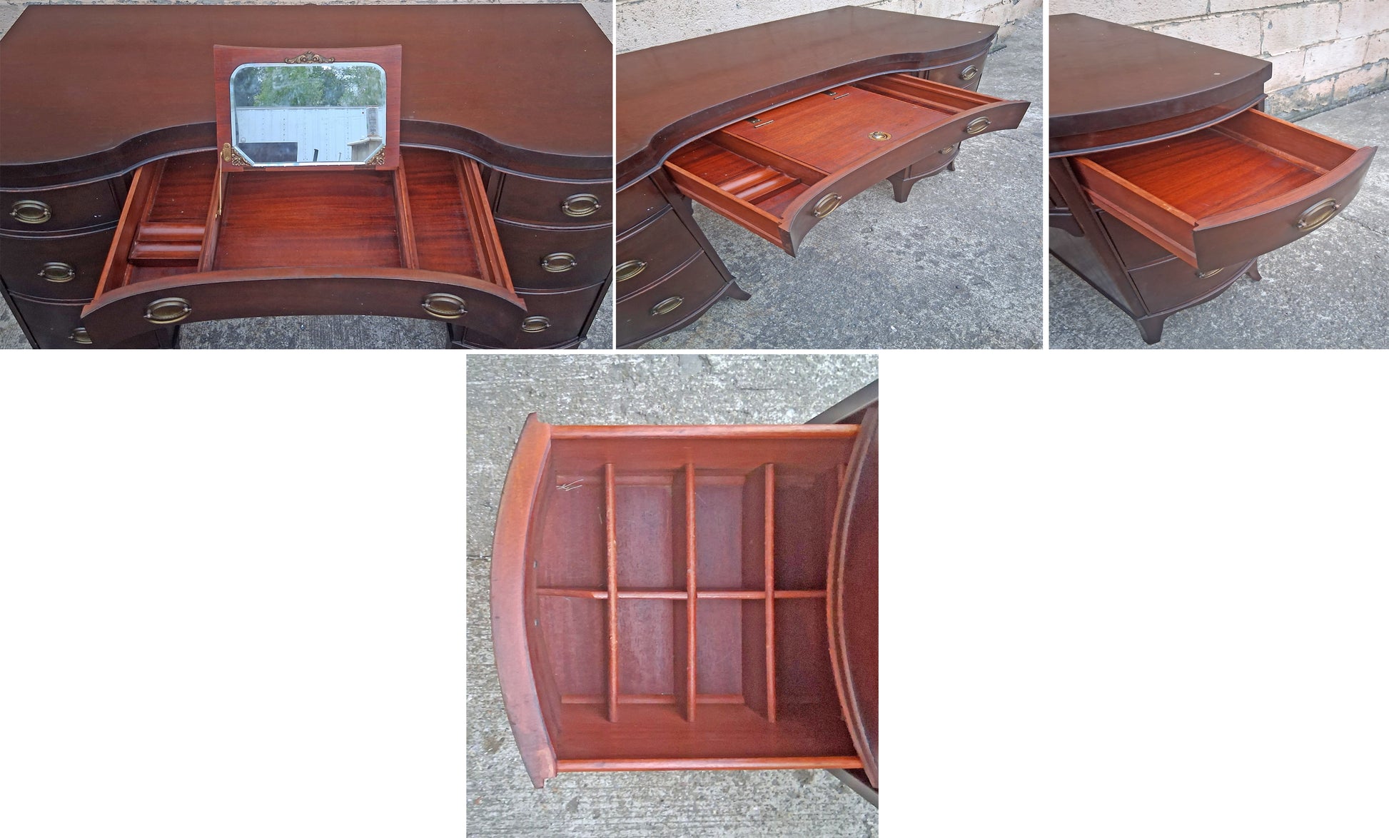 The center of the desk has a wide drawer with a hidden compartment and beveled "makeup" mirror. There are 3, smaller, stacked drawers on each side. The bottom left drawer has a built-in divider for storing different items. Notice all of the beautiful curves and designs this piece has!