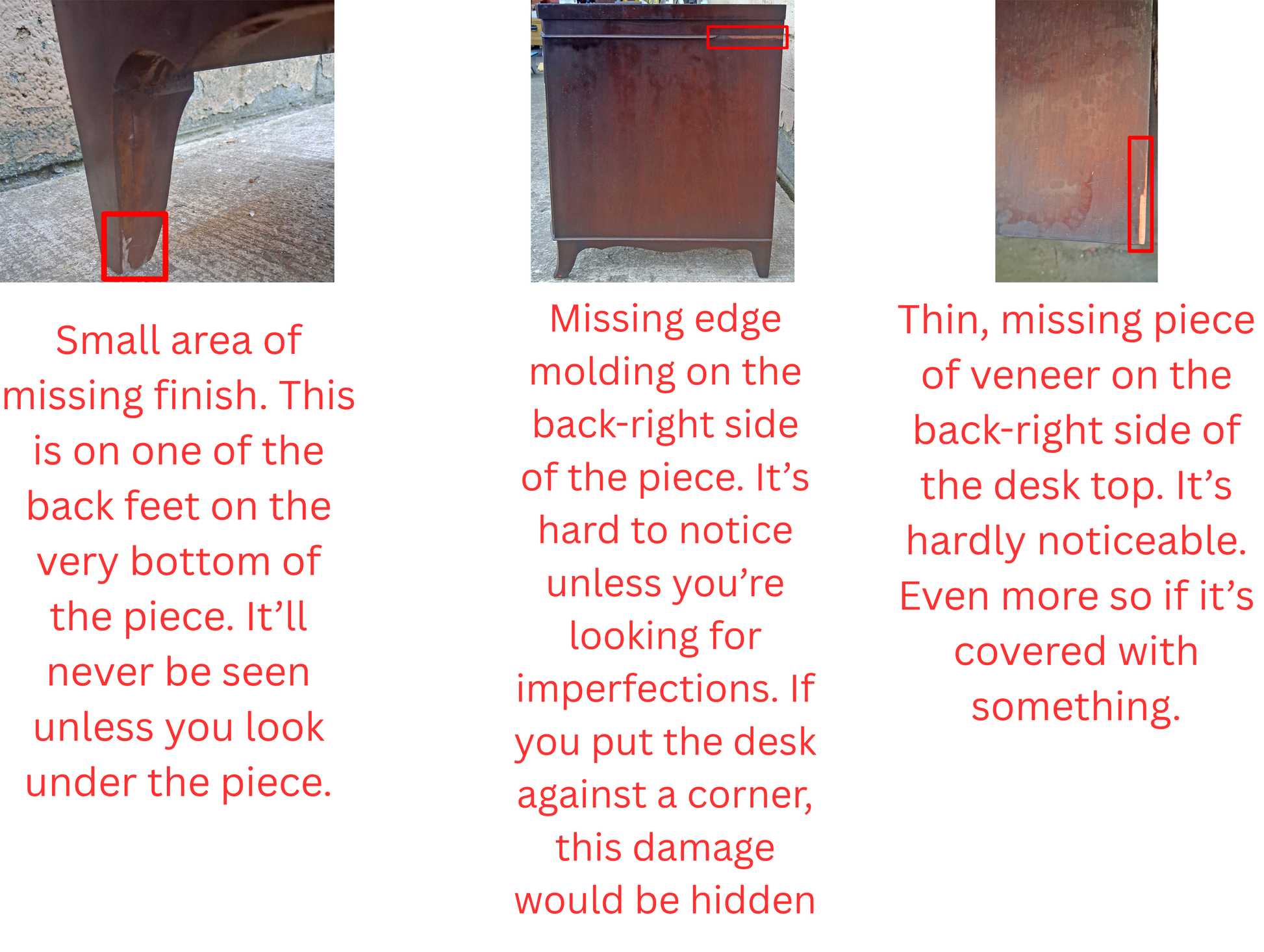 The desk has a few small nicks & scratches and spots of worn finish here and there. The worst damage found on the piece is shown and detailed in the last photo. Otherwise, there are no large breaks, cracks, gouges, rot, or warp.