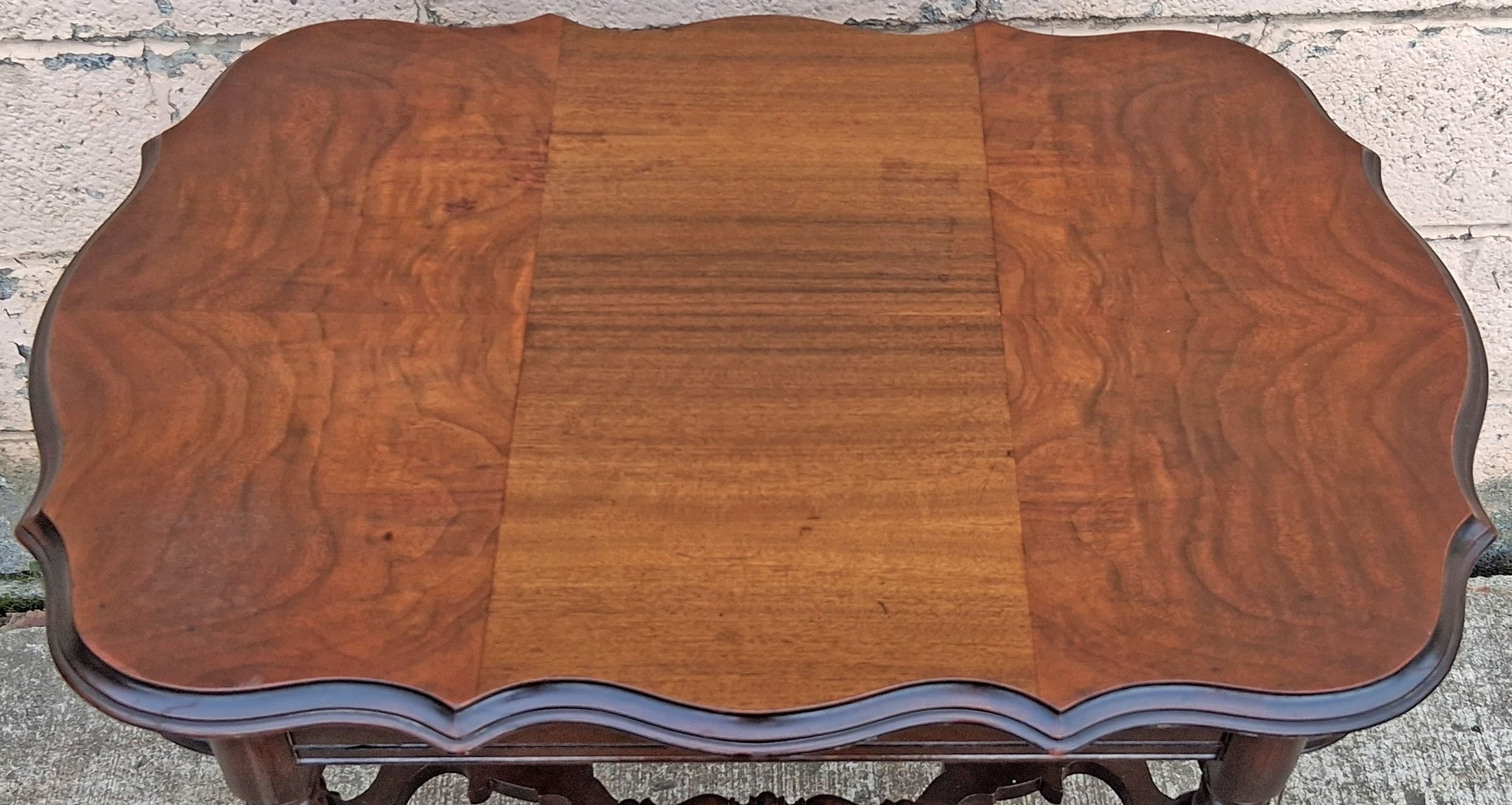 The top has a rectangular shape with serpentine edges and curves. Below, there are 6, turned legs connected by an ornate stretcher in the center. This piece has plenty of details and carvings.