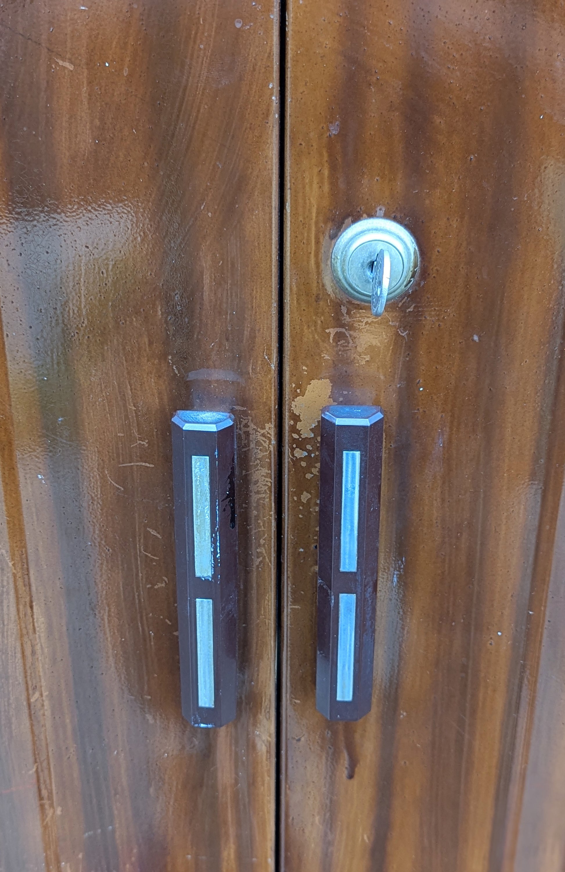There is a lock and key at the front of the piece. There is a latch on the inside of the cabinet (at the top of the left door) that has been worn from use and doesn't allow the doors to be locked tightly. Although the doors will not swing open, if you tip the cabinet the doors may open even if they're locked. If you don't need to use the lock, and just need the doors to close properly, then this won't be a problem.