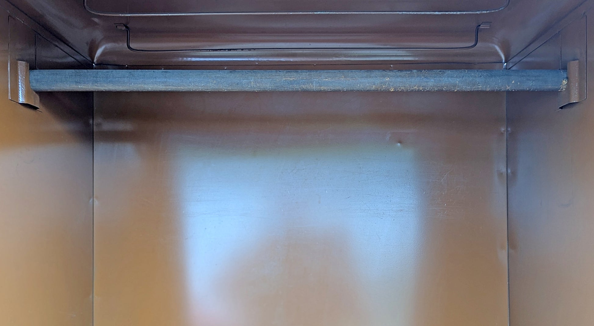 Inside, there is a coat or suit rack and 2 metal bars that form a hat holder.