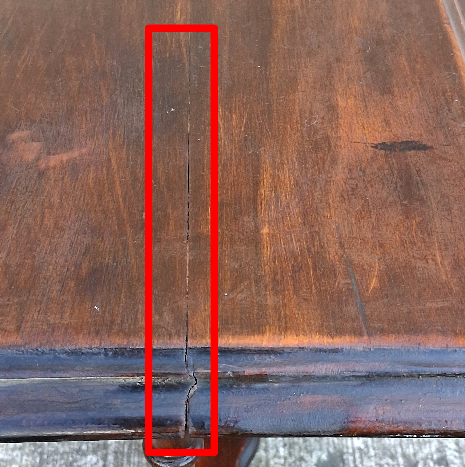 There is a small separation between the 2 boards that make up the tabletop (see last photo). However, it is only a hairline separation and doesn't pose a threat to the structural integrity of the piece.