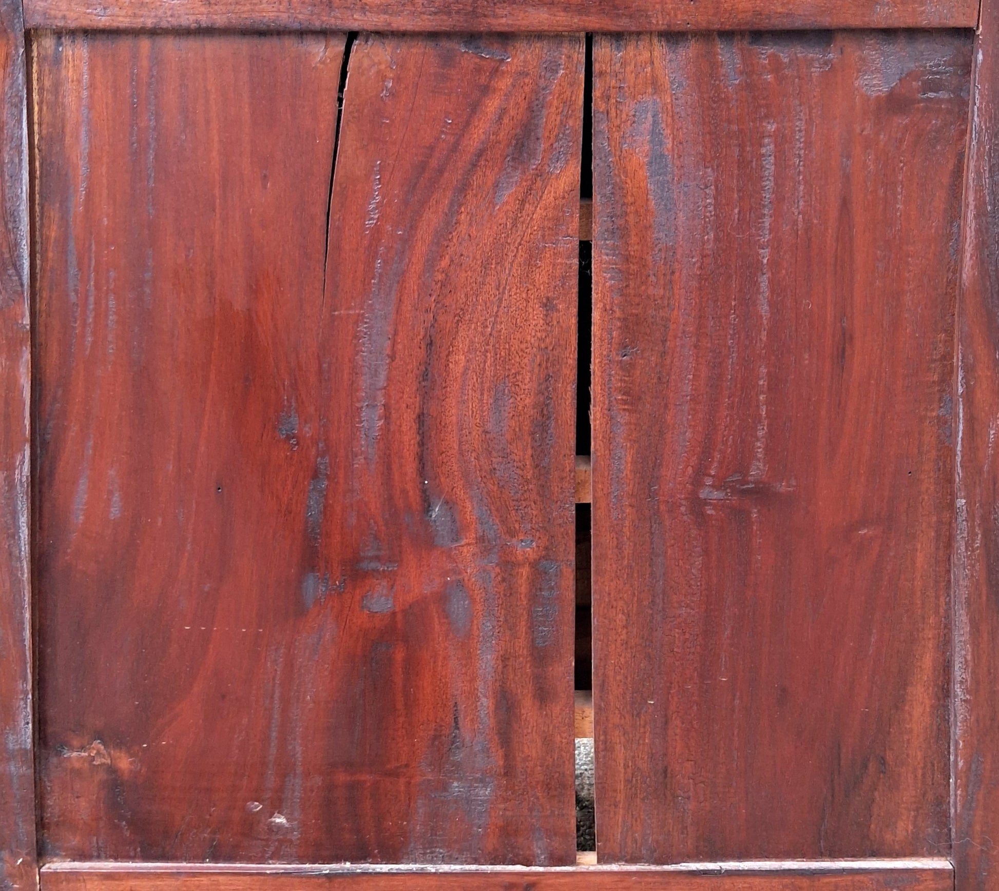 There is a small crack in the front panel (see 2nd to last photo). However, it's completely blocked by the top of the desk, and is only visible unless you're bending down. The back panel is split (see last photo). Since it's on the back, if you put the desk against the wall, it'll never be seen. Otherwise, The desk just has nicks, light scratches, and spots of worn finish here and there--typical wear for an old, used desk. However, there are no broken or cracked joints, gouges, rot, or warp.