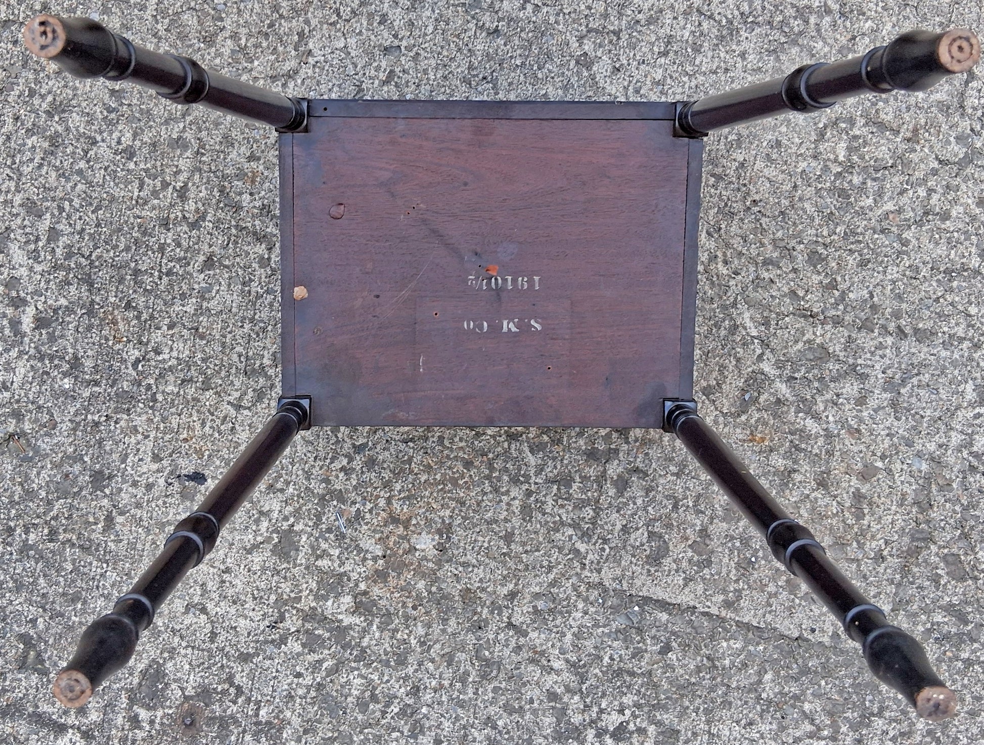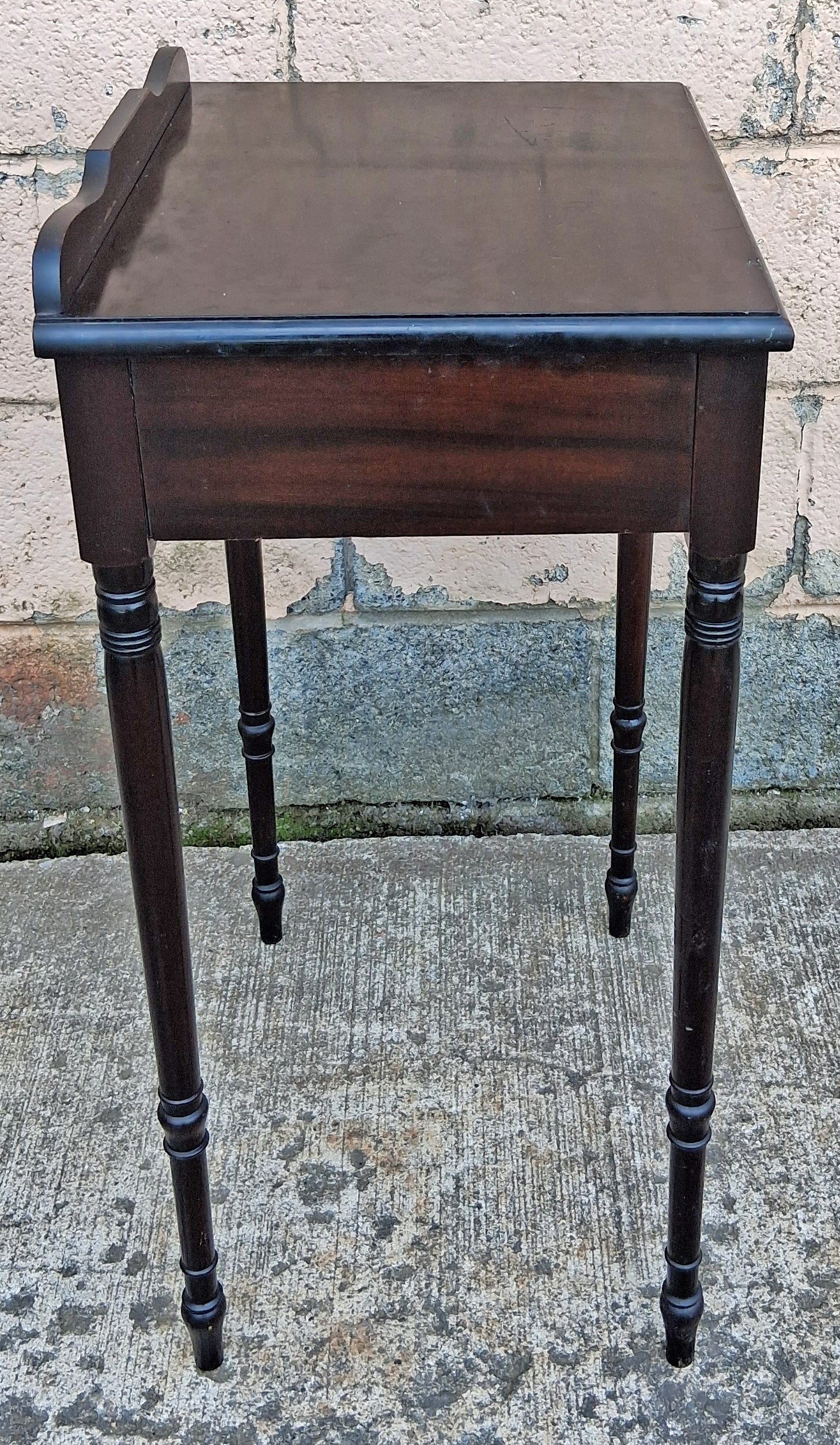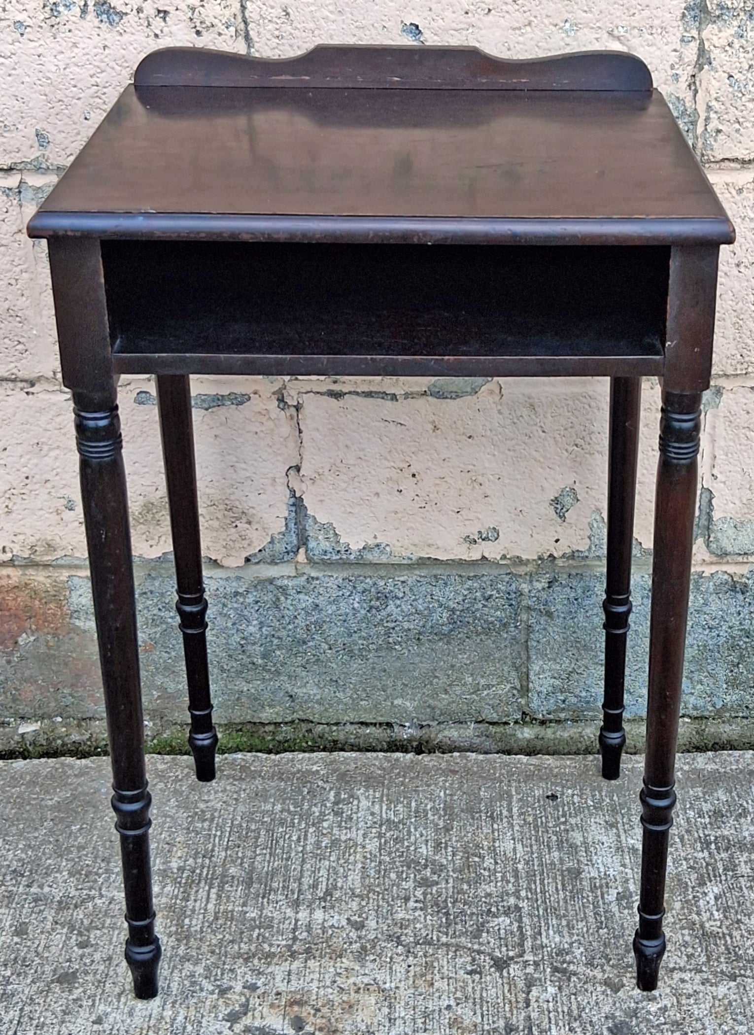 Lovely, vintage end table or nightstand salvaged from Northeastern PA. This piece is made of solid walnut. It has 4 beautifully-turned legs and a cute backsplash on the rear edge of the top. Underneath the desk there is a stamp showing that the table was made in 1910.