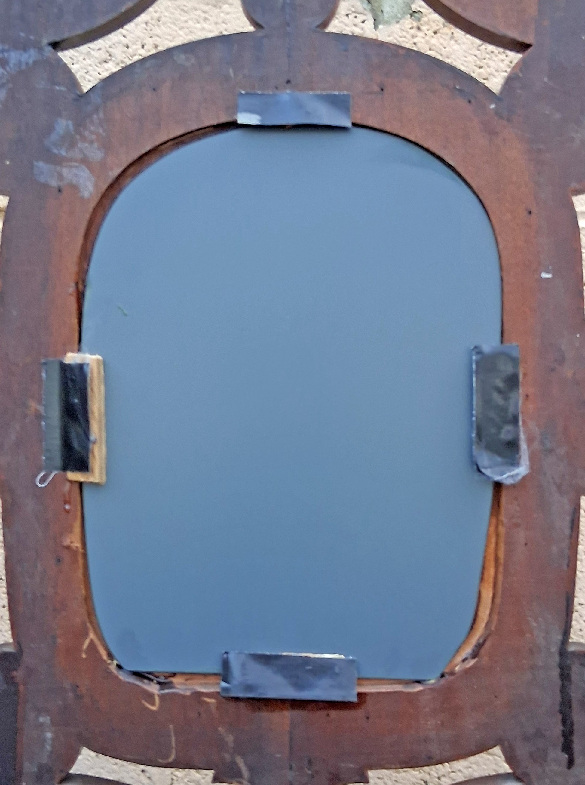 The glass is new, and when it was replaced, the previous owner just secured the glass with strong duct tape and wood. Although it sounds like a crude way to secure the mirror, the glass is stuck in place and won't go anywhere unless you remove the backing.