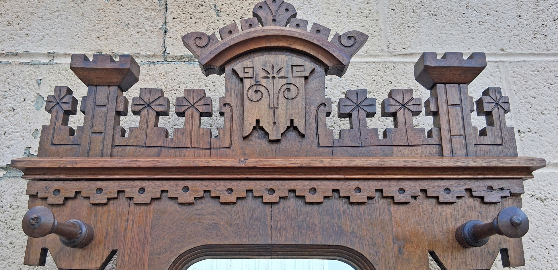 The hall tree has a unique, Eastlake design with numerous ornate carvings and details.
