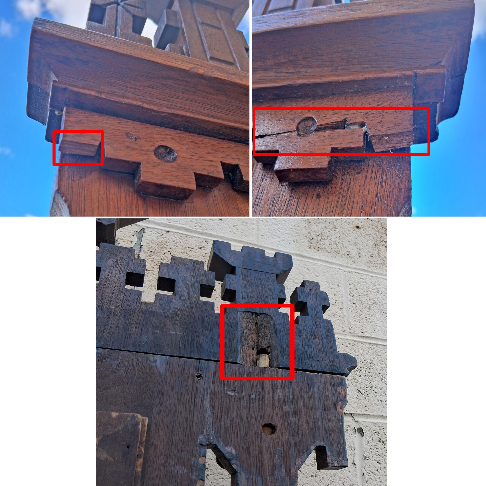 Considering its age, the piece is in excellent condition with only the typical nicks and scratches that you would expect to find on old, used furniture. The only breaks I could find are in the last photo. The worst break isn't even visible from the front, as it's on the back. Otherwise, There are no broken or cracked joints, gouges, rot, or warp.