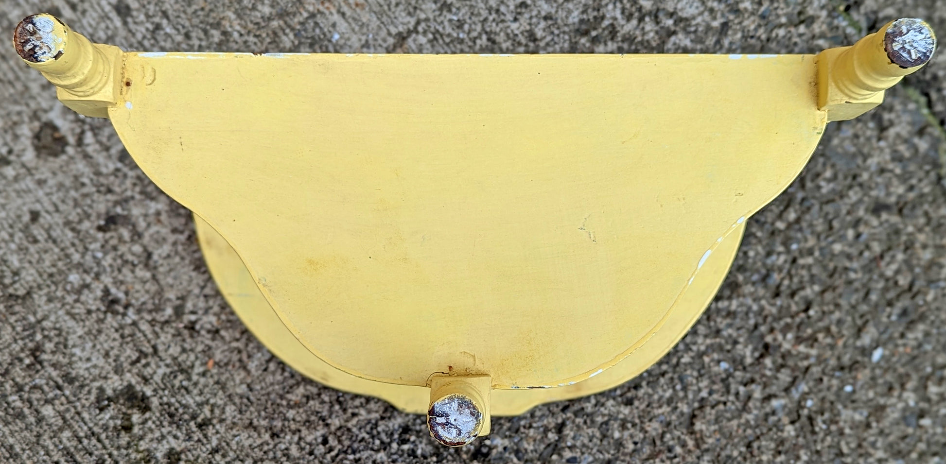 Exquisite, vintage console table salvaged from Northeastern PA. It is made of solid wood and has a distressed yellow paint.