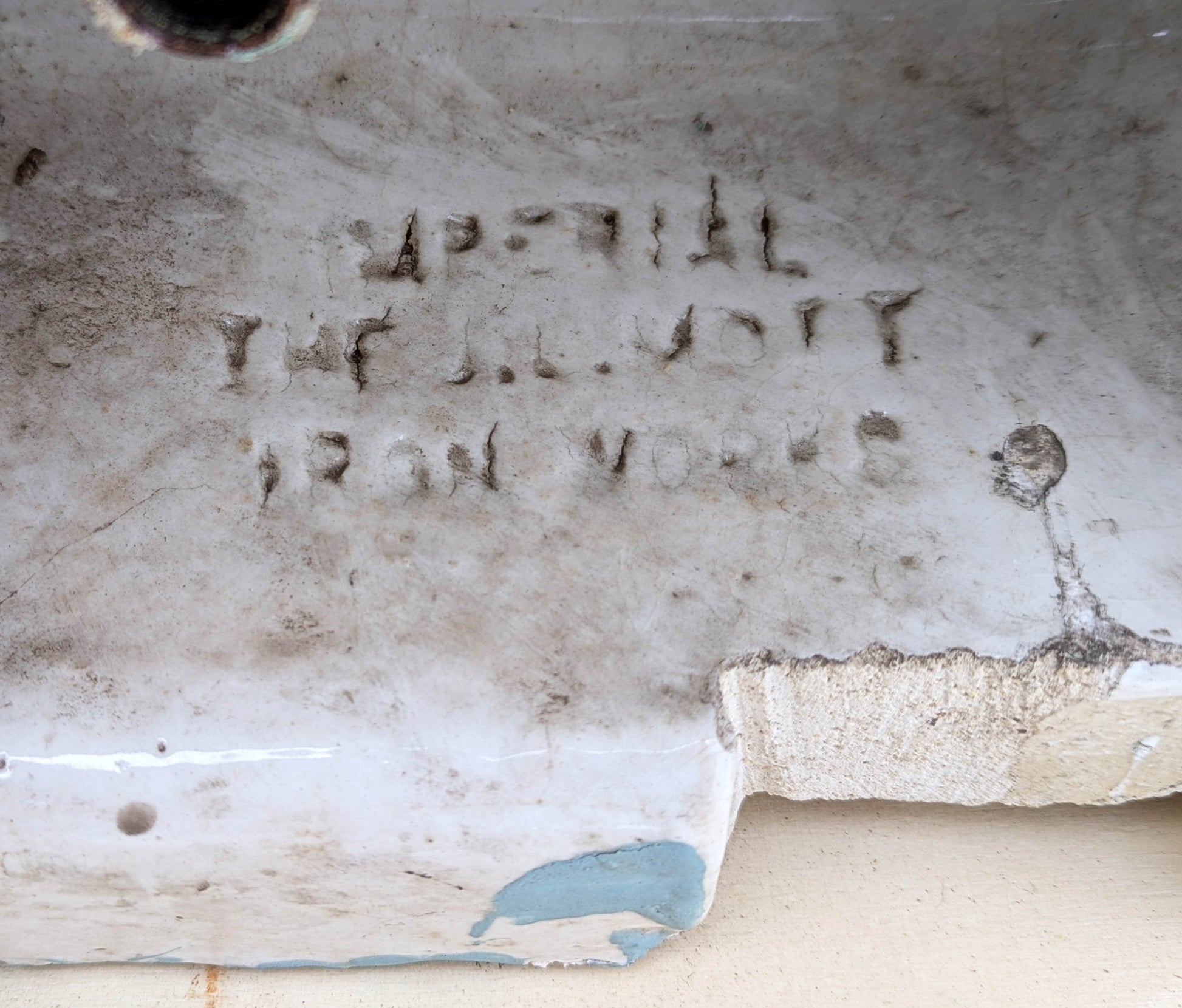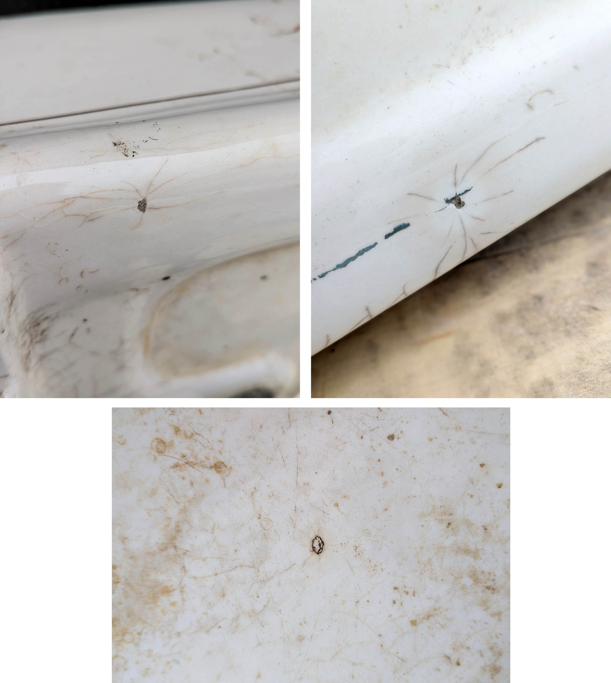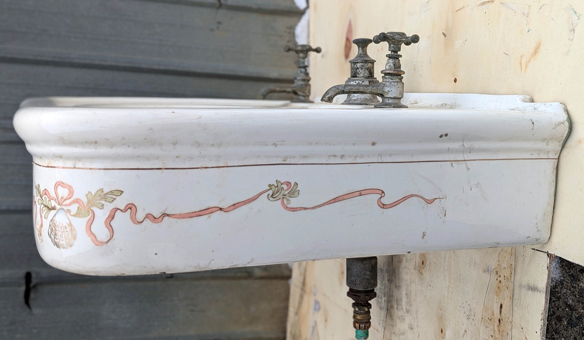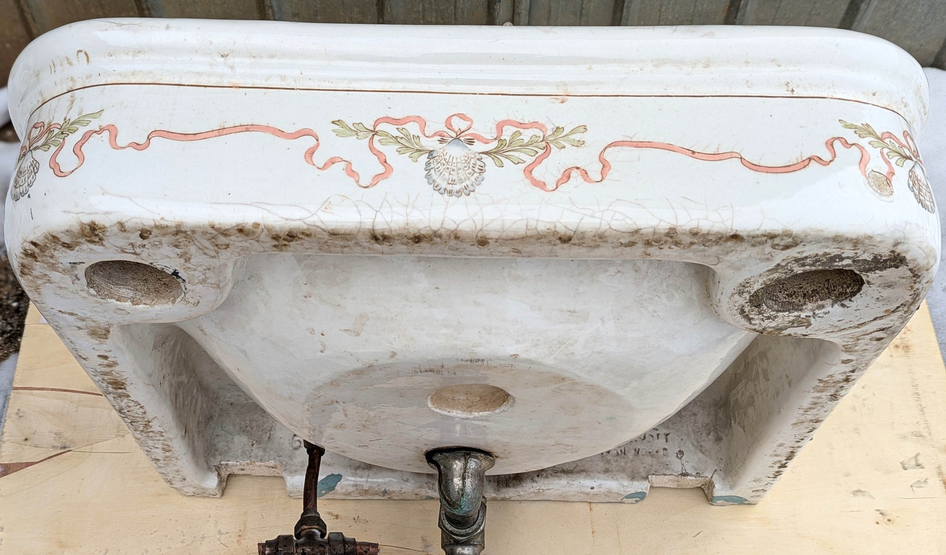 The previous owner sold it to us because he remodeled the bathroom and it didn't fit in with the new layout that he planned. Considering that the sink is about 120 years old it's in great condition. There are some chips along the back, upper edge where the sink connected to the wall and there are 3 tiny chips that we put together in a single photo. The worst blemish is a fingernail-sized break in one of the outer corners (directly next to a painted seashell motif)--see close up photo. It was filled in long ago with some kind of composite and is very hard to spot unless you are looking for flaws.