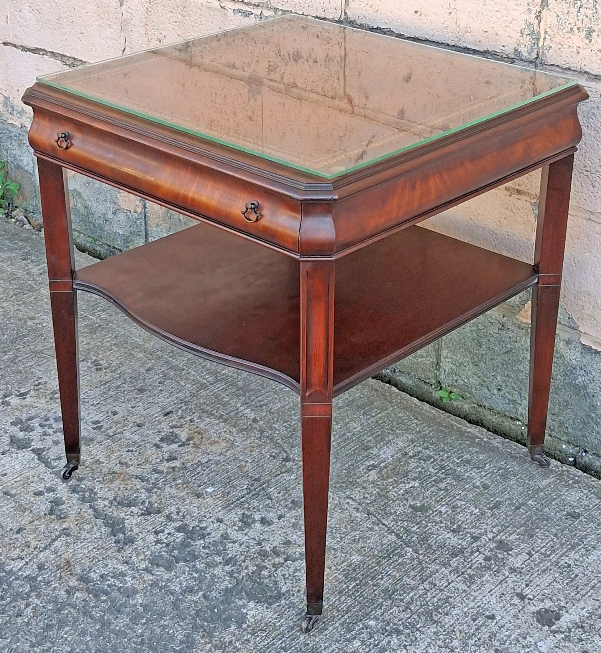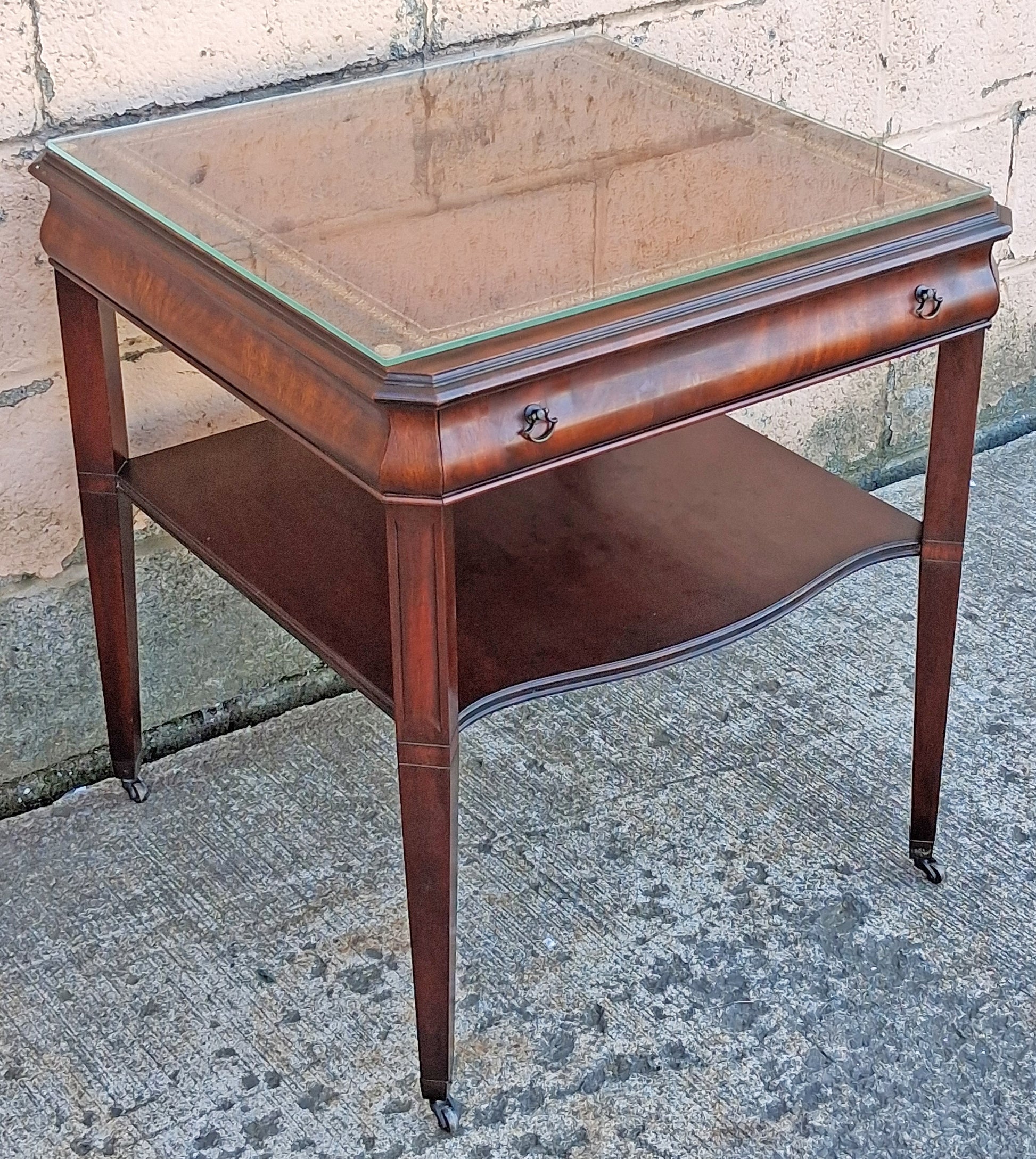 Antique Vintage Old Salvaged Reclaimed Chippendale Colonial Style Solid Mahogany Leather Glass Top Side Accent Bedside Table Nightstand